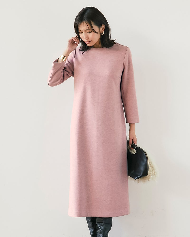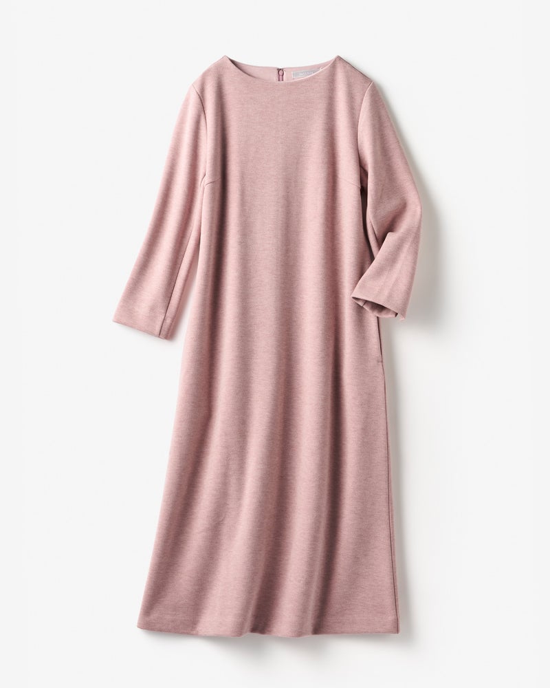 スモーキーなピンク色と、少しフレアの入ったデザインはシンプルながらとても上品で使い勝手のあるとても良い商品だと思いますが、一点だけ残念な点があります。両側に付いている隠しポケットは、ポケット必須の人には便利かと思いますが、このデザインのワンピースにポケットを付けるのは、完全にデザインを損なうことになっていると感じました。ポケット生地も表地と同じ厚めのものですので、ポケット口が開くことでヒップ辺りが膨らんでしまい、シルエットが台無しになるように思いました。