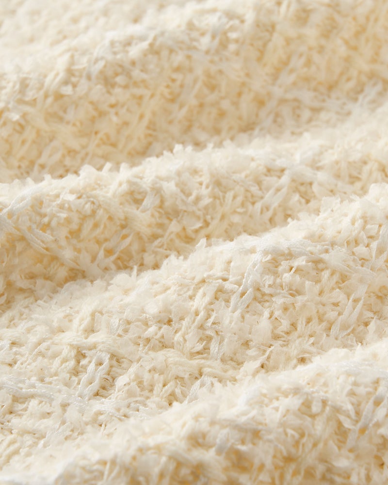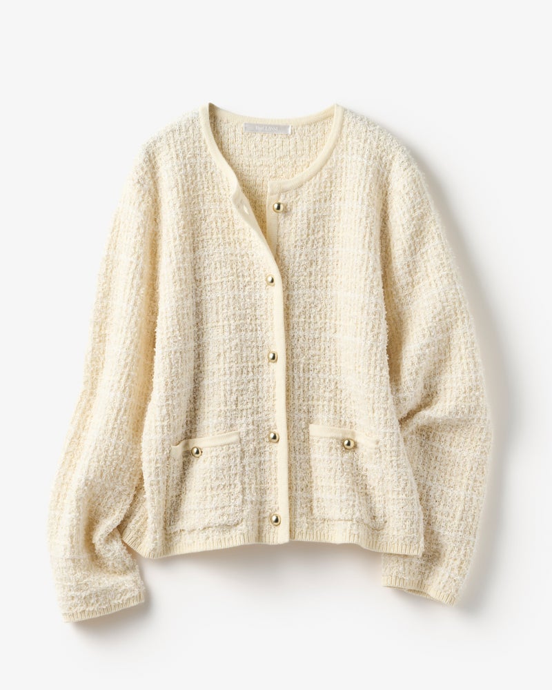 • テープヤーンとフリンジヤーンを組み合わせ、ツイード調に編み上げたニットジャケット。エレガントなのに袖を通すと驚くほどラクちん。しなやかに身体になじみ、きちんとしたシーンでも肩の力を抜いて過ごせます。カジュアルに着ても漂う品格が、大人の毎日を上質に。