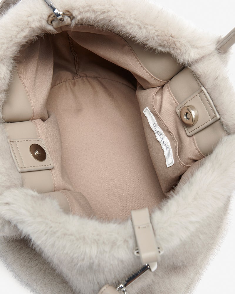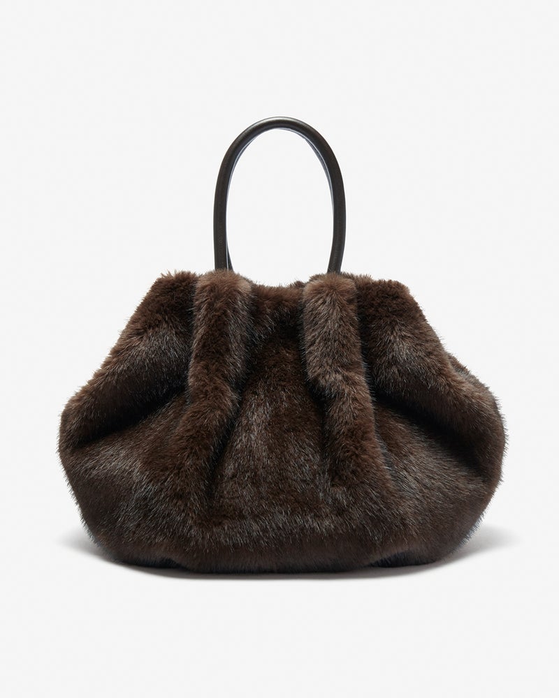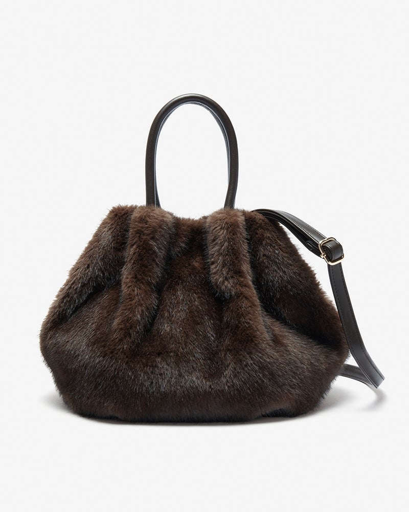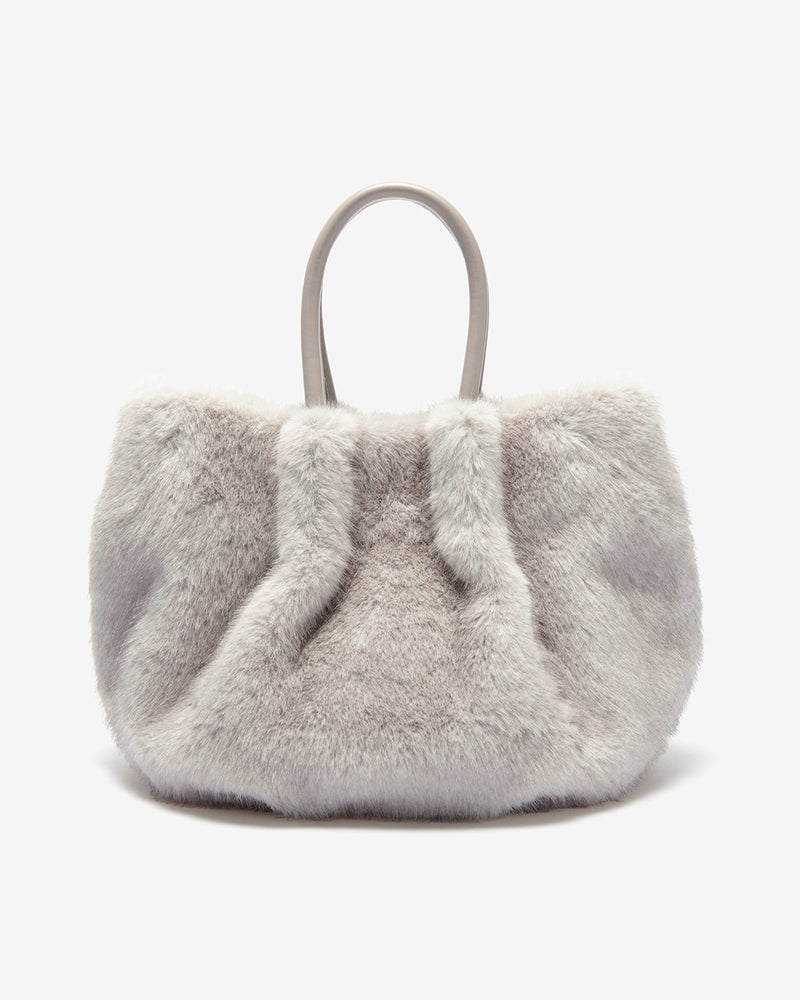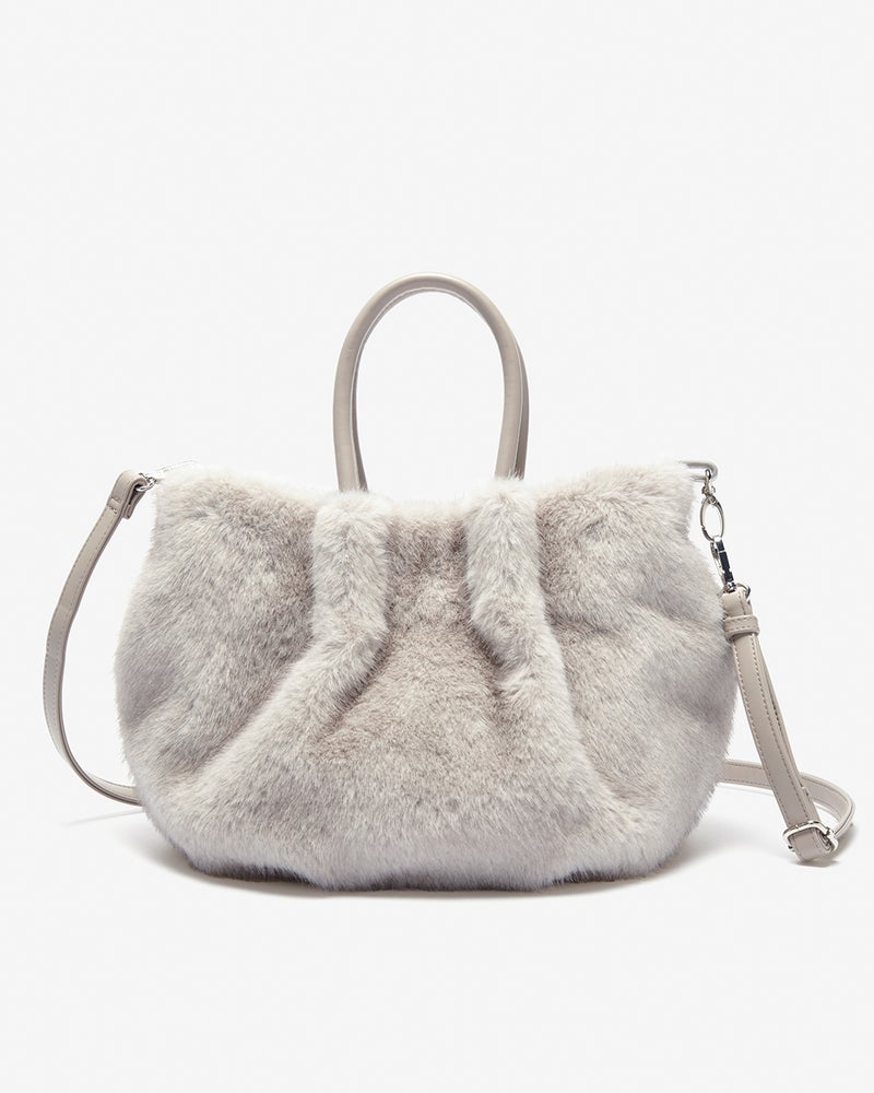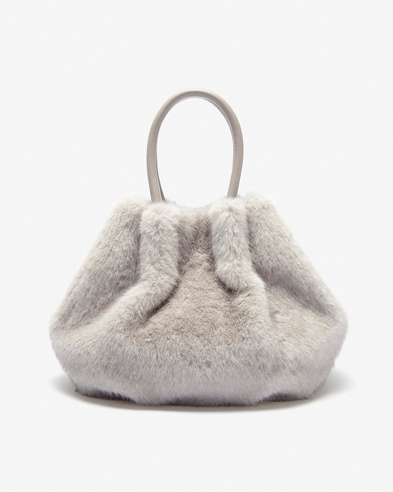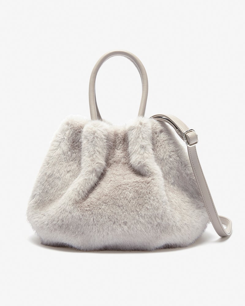 - 思わず頬ずりしたくなるような、なめらかなエコファーを使用。ハンドル部分にギャザーを寄せた、丸みのあるフォルムがフェミニンな印象です。コンパクトに見えて収納力も抜群。肩かけや斜めがけもできるショルダーストラップ付き。