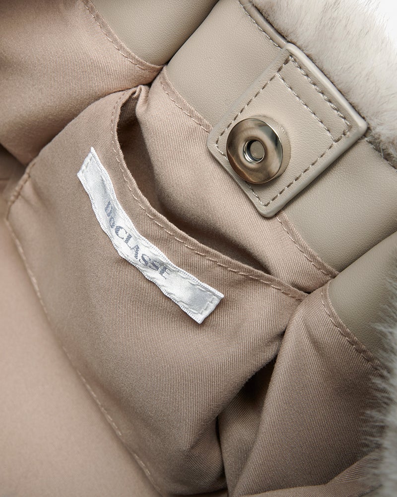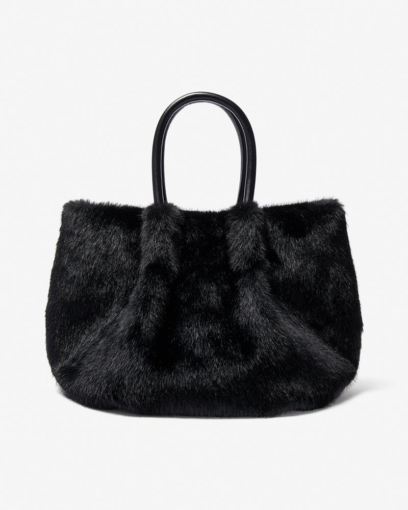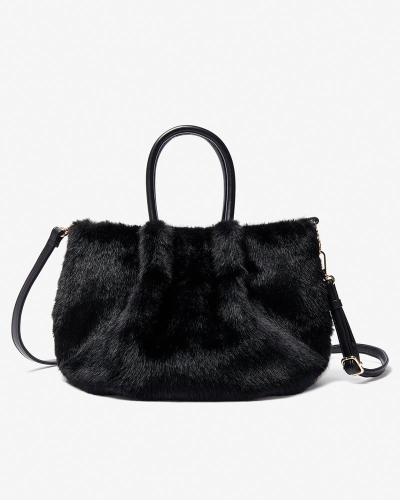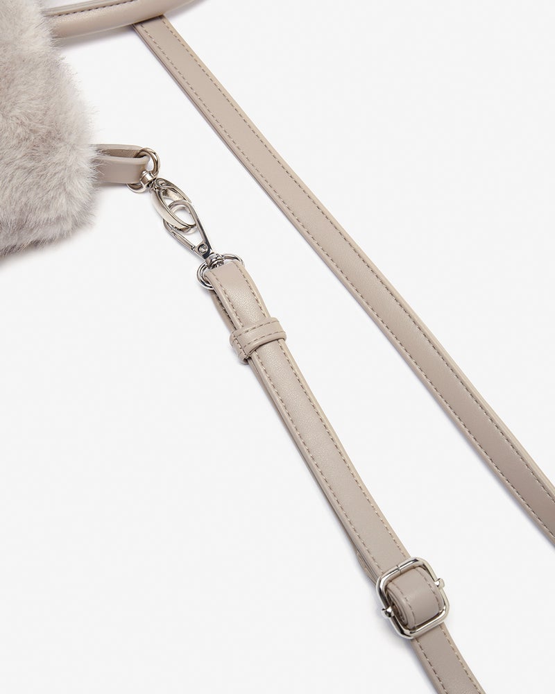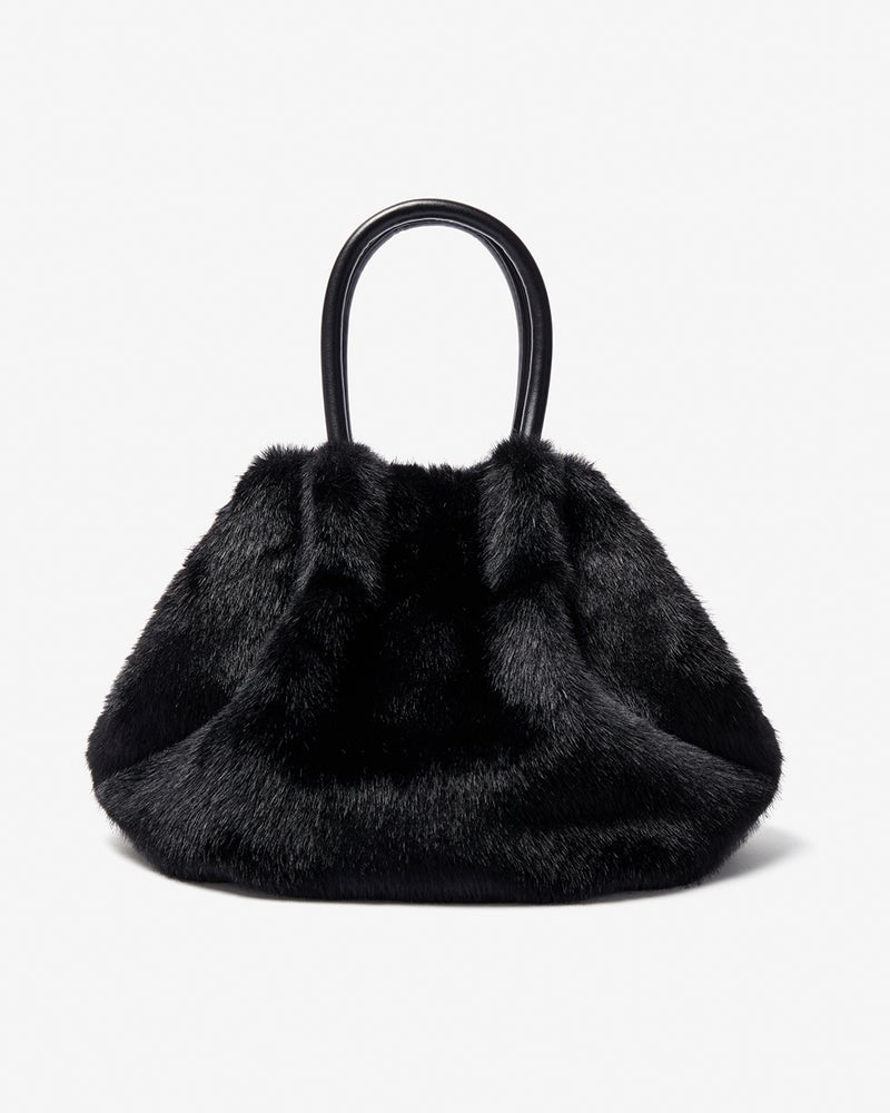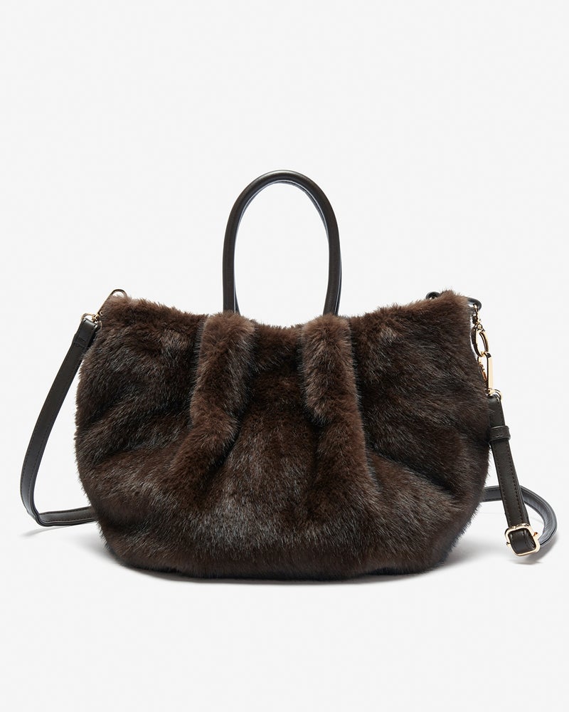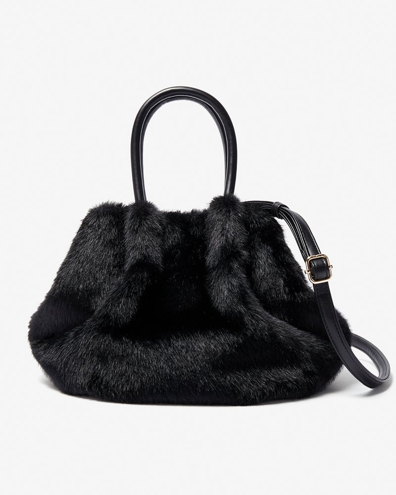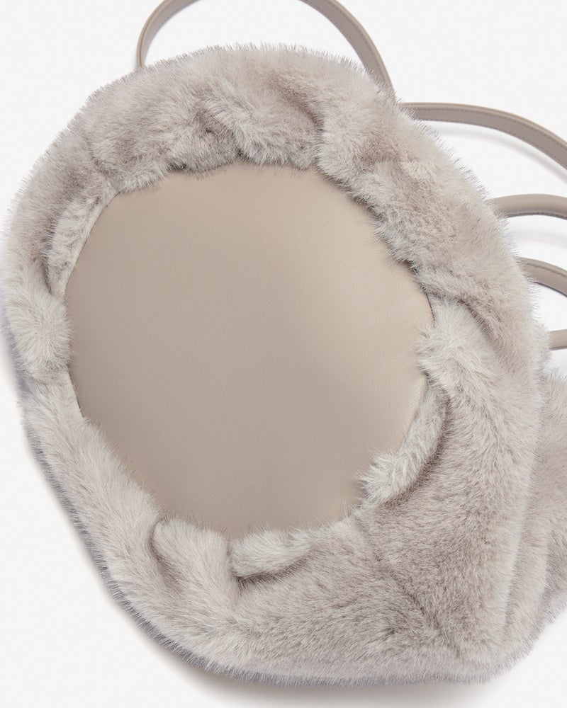 - 思わず頬ずりしたくなるような、なめらかなエコファーを使用。ハンドル部分にギャザーを寄せた、丸みのあるフォルムがフェミニンな印象です。コンパクトに見えて収納力も抜群。肩かけや斜めがけもできるショルダーストラップ付き。