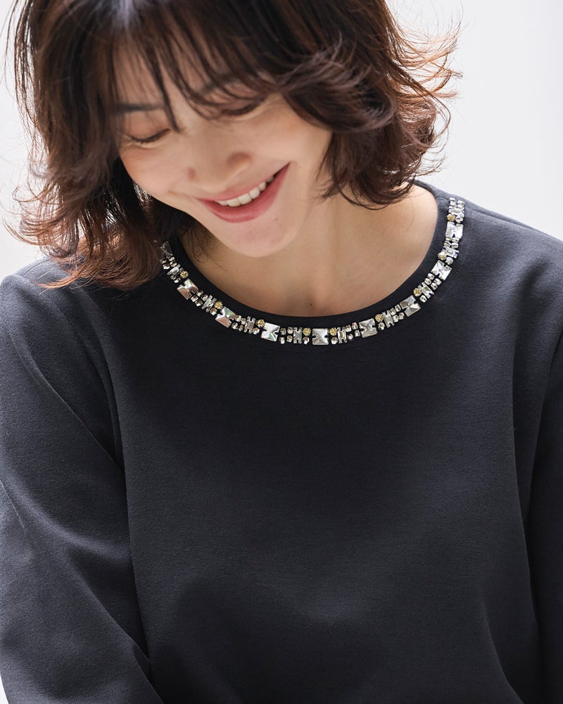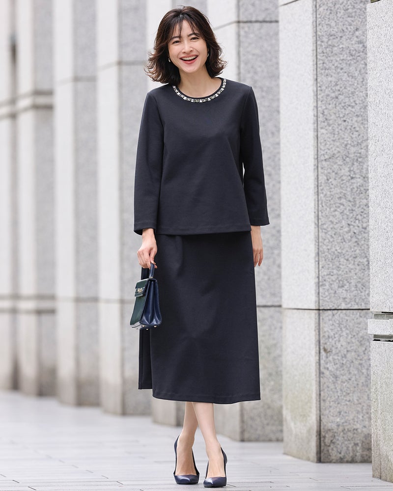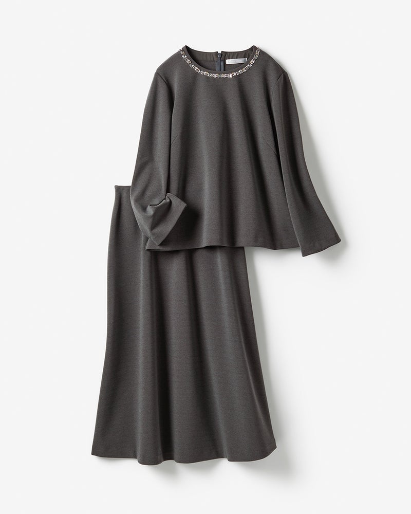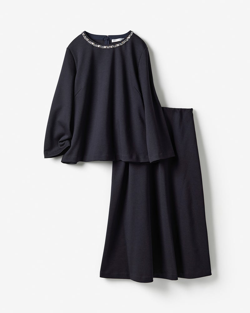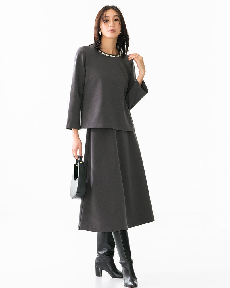 ビジューをあしらったトップスと、ミモレ丈のスカートのセットアップ。トップスは、大小のクリスタルや淡いイエローストーンを首もとにあしらった華やかなデザイン。コートを羽織った時にごろつかないよう、ビジューは前身頃のみにあしらっています。マットで上品な質感のポンチ素材はハリがあって体型が響かないのも魅力。控えめフレアのスカートは、体を入れると縦に落ち感が出て、すっきり見えを叶えてくれます。