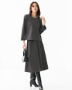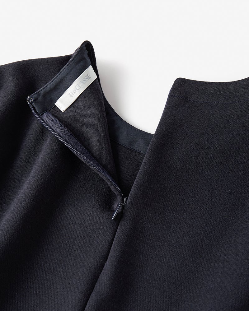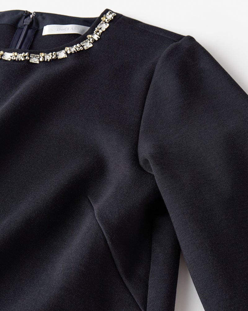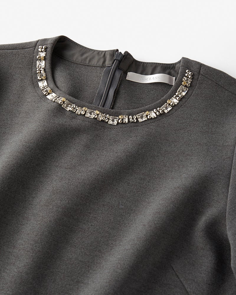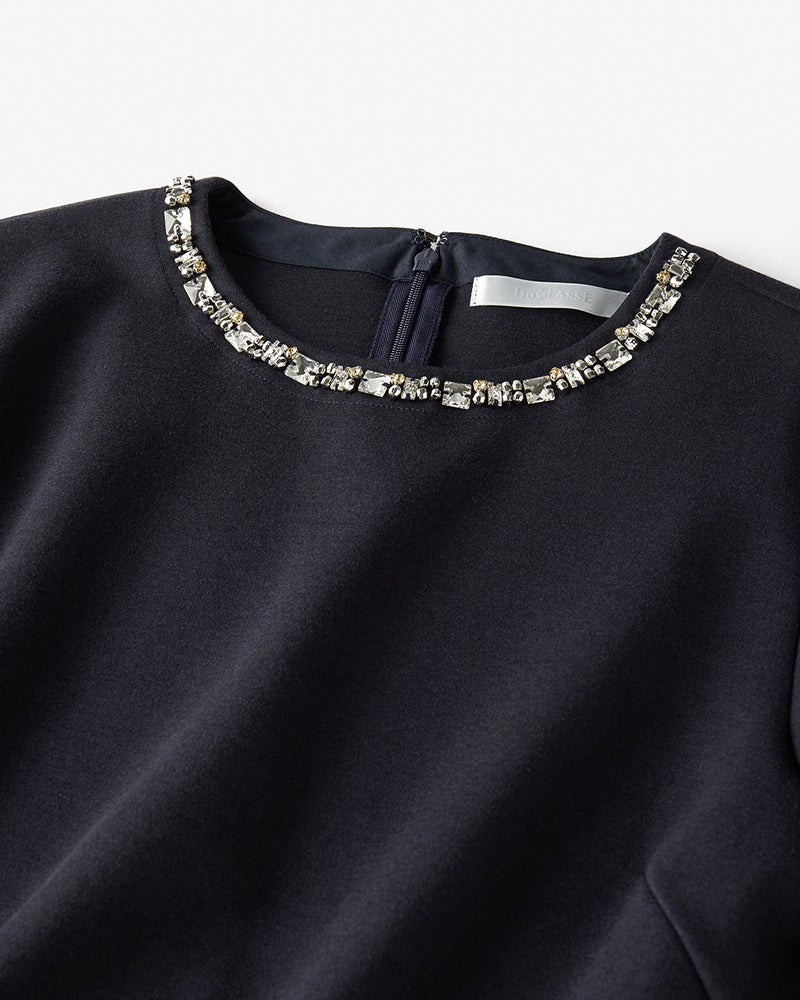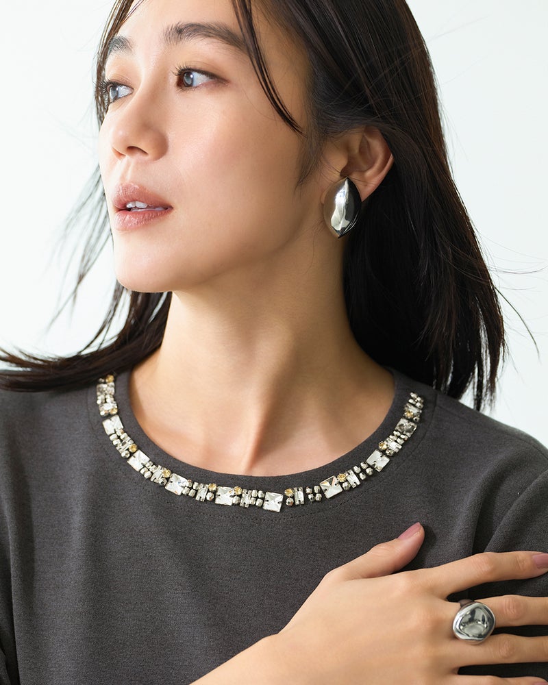 ビジューをあしらったトップスと、ミモレ丈のスカートのセットアップ。トップスは、大小のクリスタルや淡いイエローストーンを首もとにあしらった華やかなデザイン。コートを羽織った時にごろつかないよう、ビジューは前身頃のみにあしらっています。マットで上品な質感のポンチ素材はハリがあって体型が響かないのも魅力。控えめフレアのスカートは、体を入れると縦に落ち感が出て、すっきり見えを叶えてくれます。