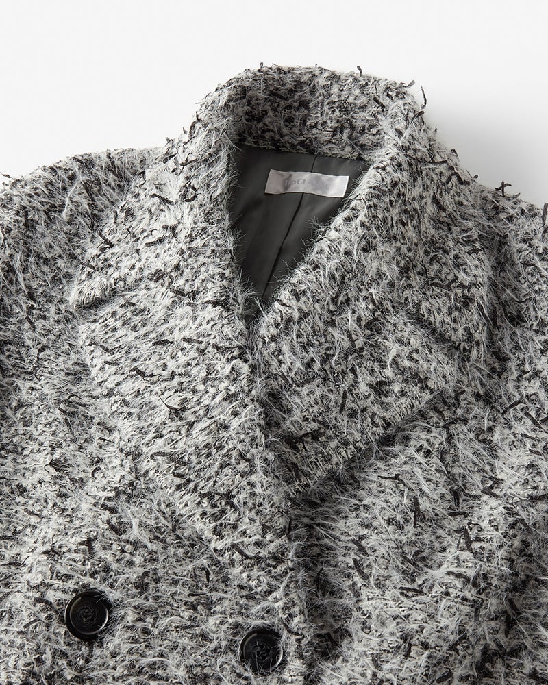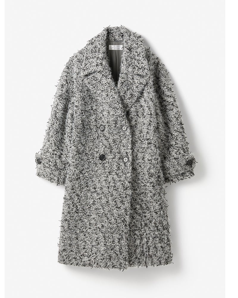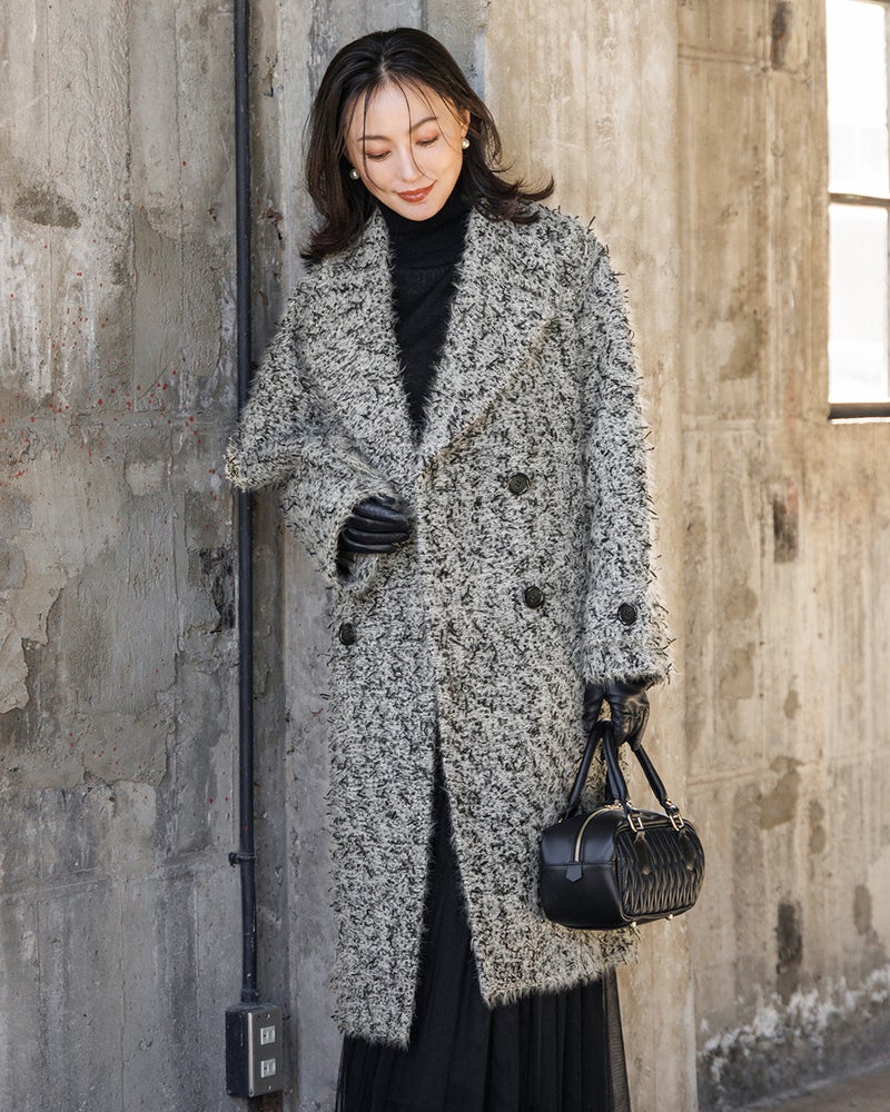 ふんわりしたファーヤーンやテープヤーン、スラブヤーンなど多彩な意匠糸をふっくらと織りあげた贅沢なミックスツイード素材。衿を大きめに仕立てたオーバーサイズロングコートは、ドレスに羽織るのはもちろん、ワイドパンツなどの辛口スタイルに合わせても上品リッチに。
