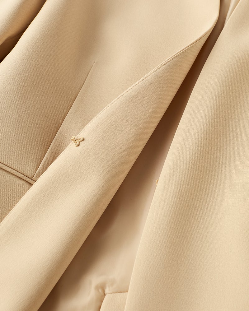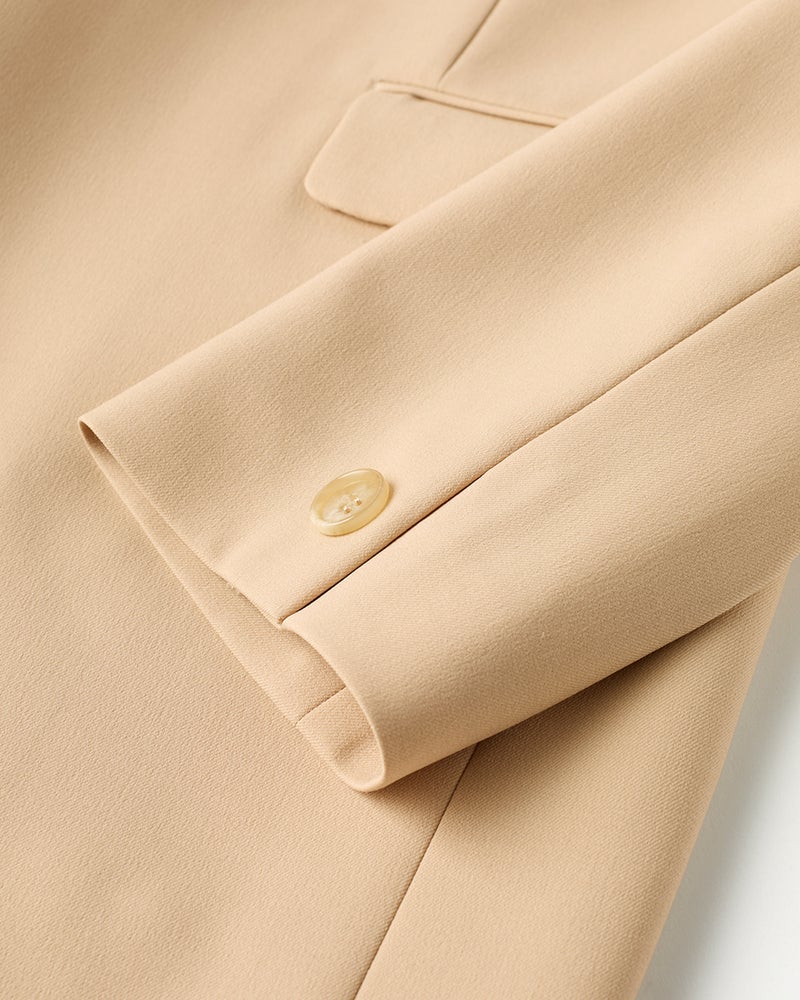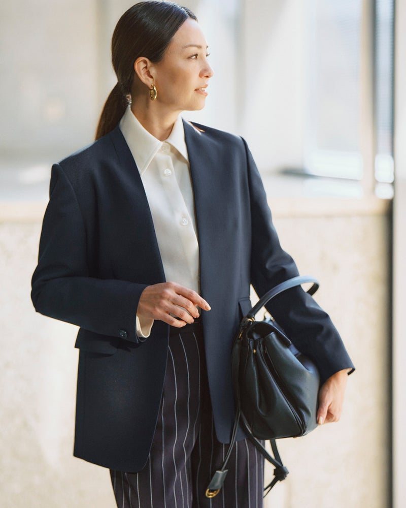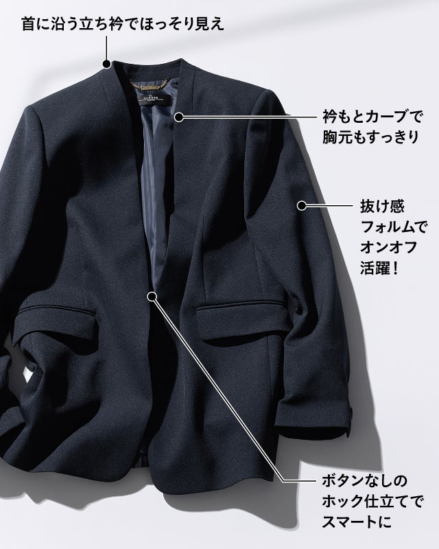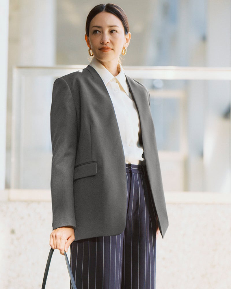 ほどよくゆとりを持たせた抜け感のあるフォルムは、オケージョンはもちろんオフにも対応。セットアップならお仕事シーンに、休日はデニムと合わせて、そんなフレキシブルな使い方も可能に。首もとをほっそり見せるさりげない立ち衿や胸元が開きにくい逆カーブ仕立てなど、カジュアルすぎず大人を美しく見せる工夫も満載。大人の毎日にちょうどいい1着に仕立てました。