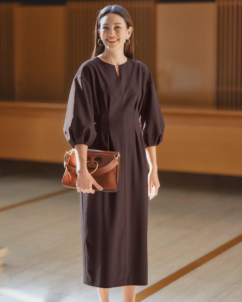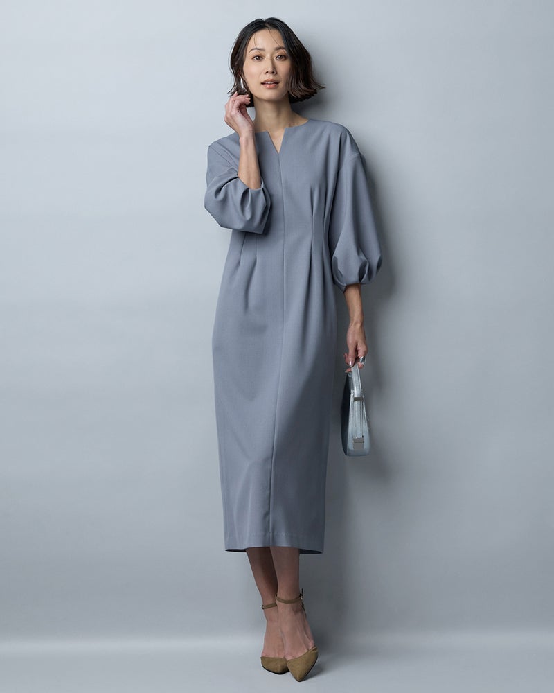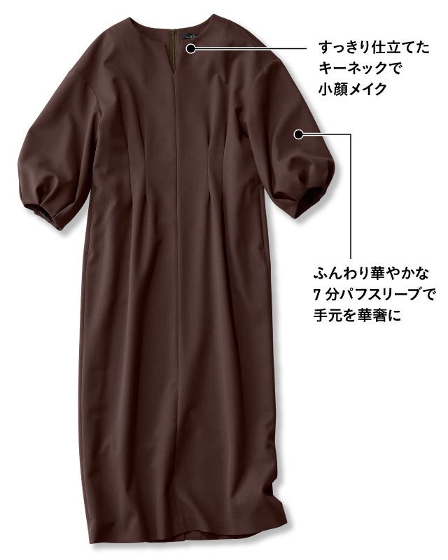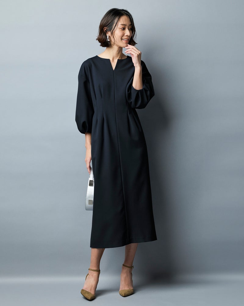 さっと1枚できちんとキレイも―。そんな大人の願いを叶えるメリハリデザインのワンピース。ウエスト部分上下にふわっとつまんだような2タックを入れることで、締め付け感なしですっきりカーヴィーなラインに。7分のパフ袖も女性らしさのポイントです。