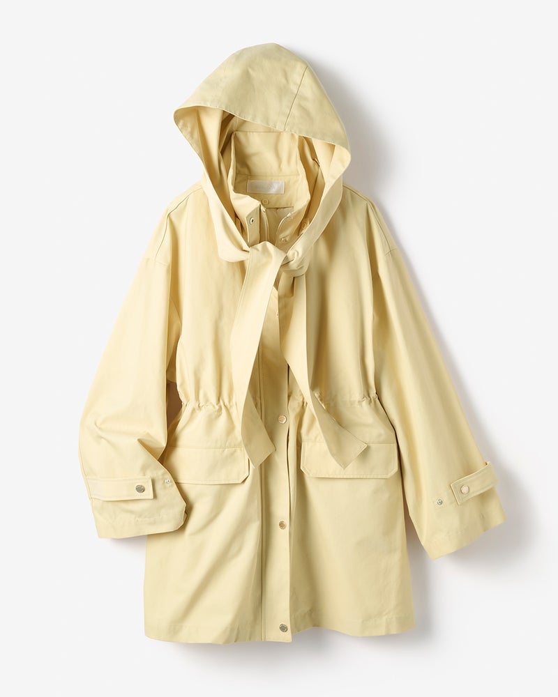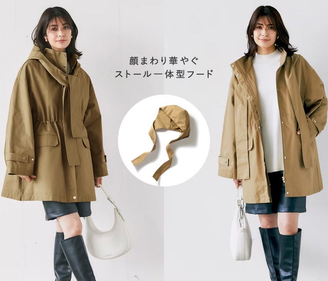 - ストール一体型フードで顔まわりにポイントを顔まわりを華やげるストール一体型のフードは、ゆるりと巻けば華やかに、結ばずさらりと垂らすとシンプルなスタイルに。着脱も楽々で、取り外すとすっきりとしたスタンドカラーに変身。