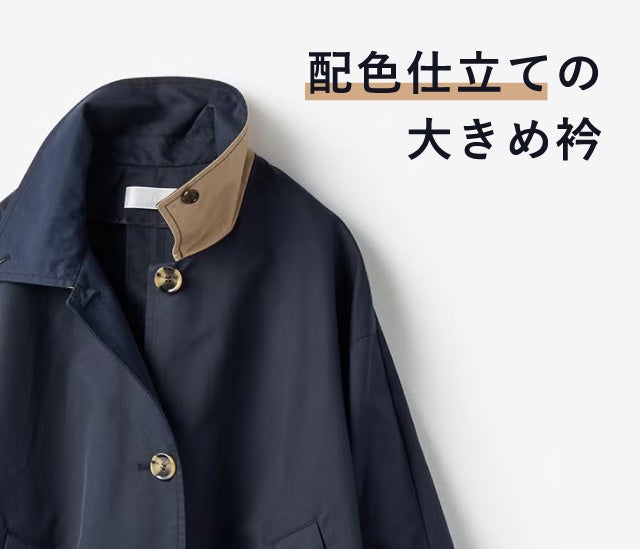 - 裏配色の衿は、ボタンを留めればスタンドカラーに変身大きめの衿は、裏を配色仕立てにしてさりげないポイントに。衿裏のボタンを留めることで、シャープなスタンドカラーになります。