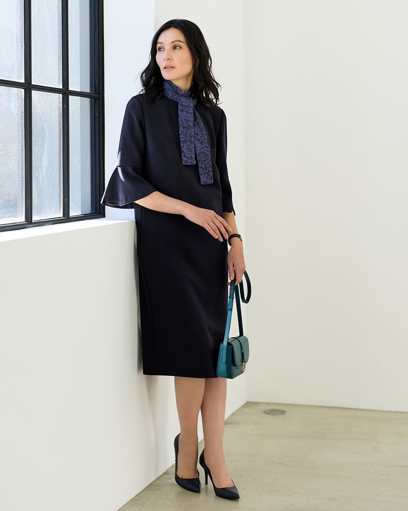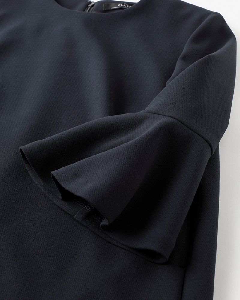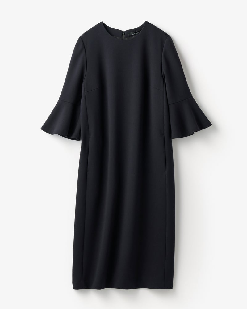 オケージョンから普段使いまで、幅広いシーンに活躍するストレートシルエットのワンピース。ふわりと揺れるベルスリーブの袖デザインで女らしさをプラスしました。素材はほどよいハリで構築的なシルエットを保つカルゼ素材。ボディラインを拾わず、シワも気にならない名品素材です。