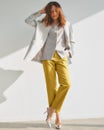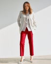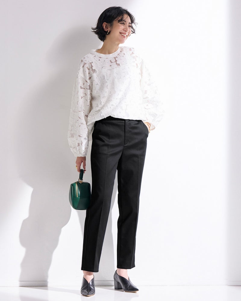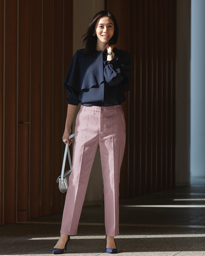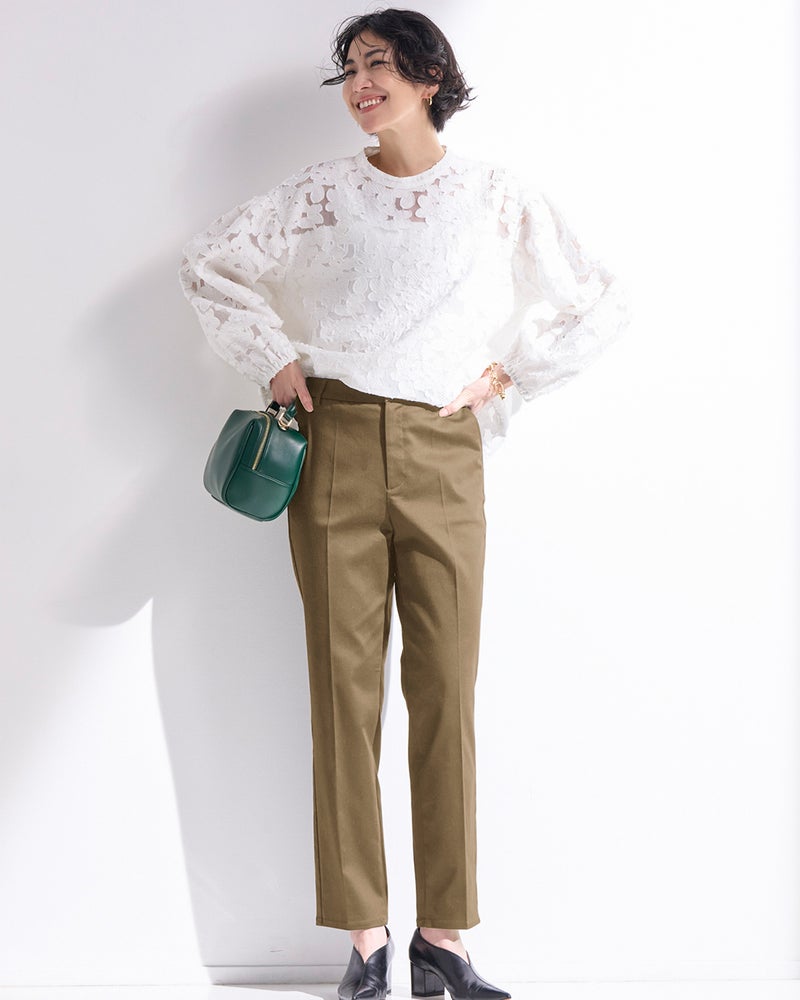 ほど良くきちんと感のあるセンターライン入りのスリムストレートは、お仕事シーンにもおすすめのスタイル。女性の体型に寄り添いながらも脚のラインを拾わず、ほっそり美脚を演出します。