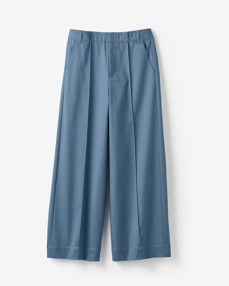 - 艶感がありしっかりした生地で綺麗なブルーです。身長が低いのでワイドパンツはハードルが高かったのですが、この商品は腰回りがスッキリしていて筒が広くてもバランス良く履けます。中央のピンタックも効いています。ストーンと2着購入しました。ただ欲を言えば5号サイズがあれば尚良かったかな。