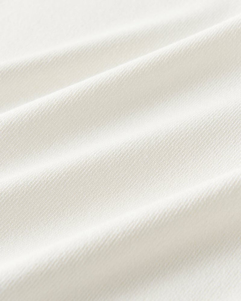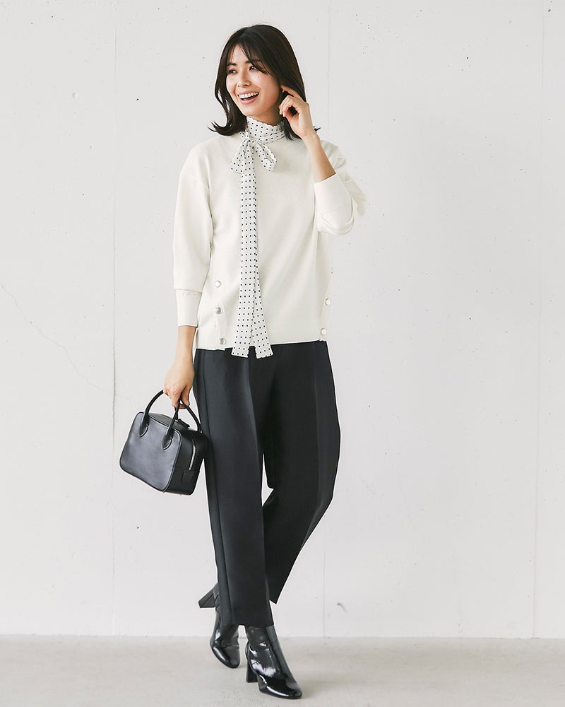 1枚で着ても素肌に心地いい、なめらかな天竺編みのプルオーバー。ゆるりと着られる快適フォルムと、ほっそり見えるシルエットを両立しました。両サイドに並んだ艶消しメタル調のボタンが、シンプルな中にさりげないアクセントを添えています。