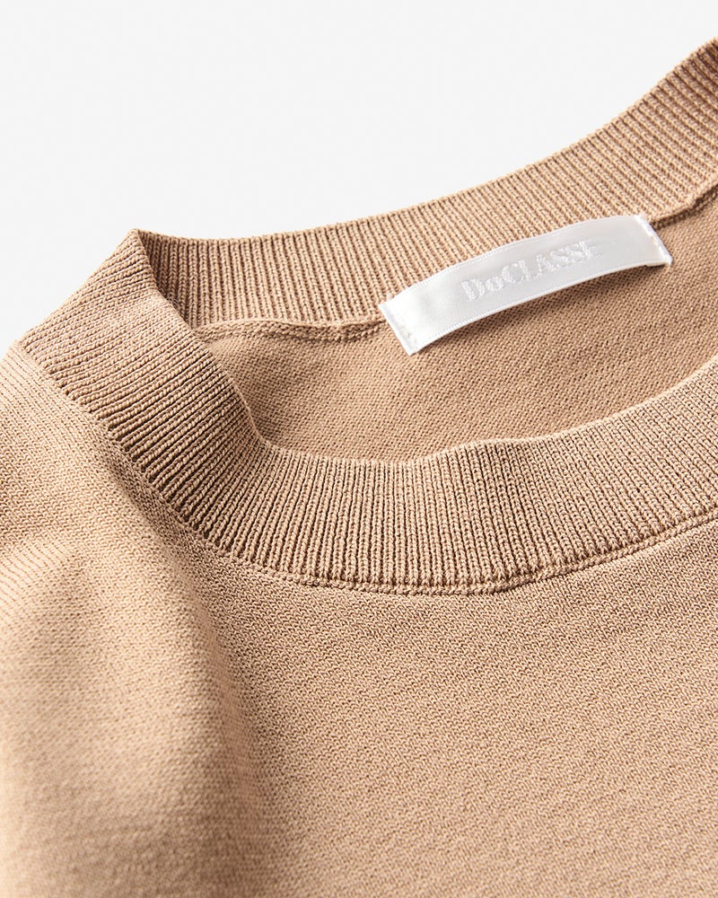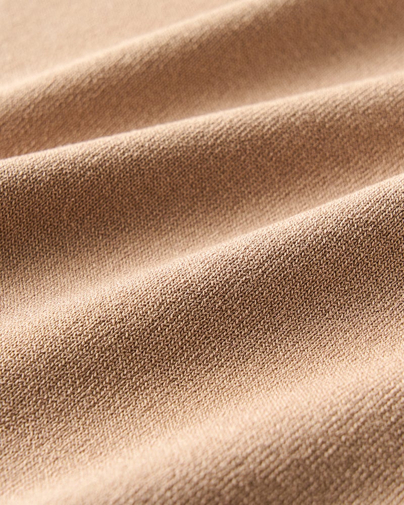 1枚で着ても素肌に心地いい、なめらかな天竺編みのプルオーバー。ゆるりと着られる快適フォルムと、ほっそり見えるシルエットを両立しました。両サイドに並んだ艶消しメタル調のボタンが、シンプルな中にさりげないアクセントを添えています。