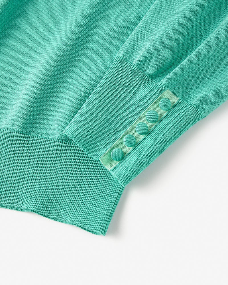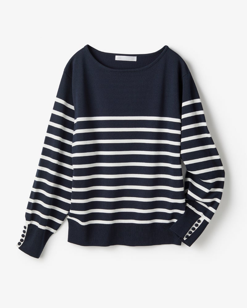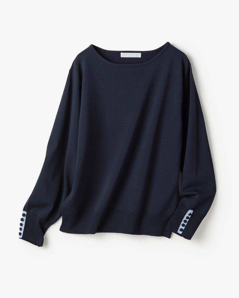 小顔見せも叶える美麗ボートネック首まわりをすっきり見せながら、下着の線を出さない絶妙ラインのボートネック。袖口はくるみボタンを配してブラウスのような上品デザインに。