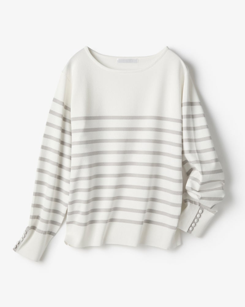 • ストレッチニット・袖ボタンボートネック 詳細画像 ホワイトxグレー 1