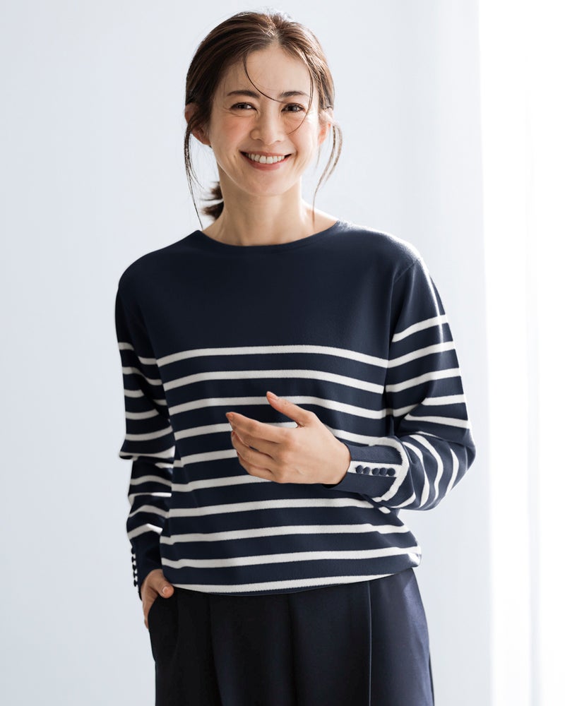 • ストレッチニット・袖ボタンボートネック 詳細画像 ネイビー×ホワイト 1