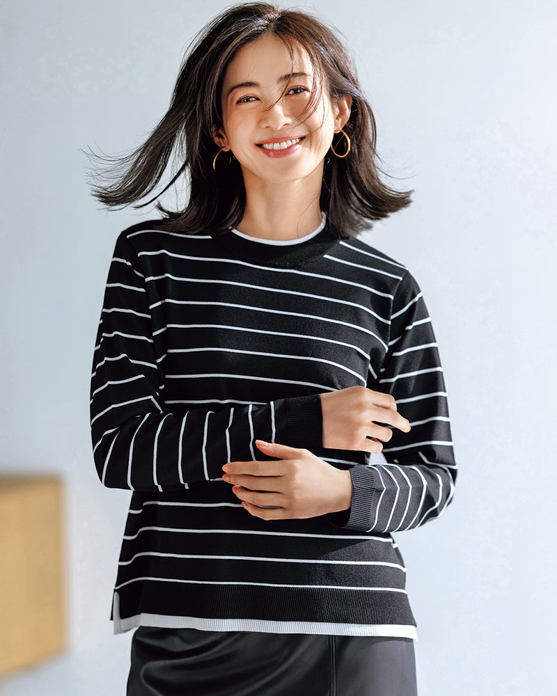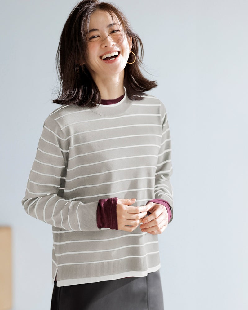 ストレッチ糸を添えて編みたてることで、なめらかな着心地ときれい見えするハリ感を両立したハイゲージニット。重ね着しても着ぶくれず、1枚でももちろん着映える、ロングシーズン活躍してくれる毎日のマストアイテム。袖口&衿ぐりを二重仕立てにした重ね着風デザインなら、コーデいらずで旬スタイルが完成します。