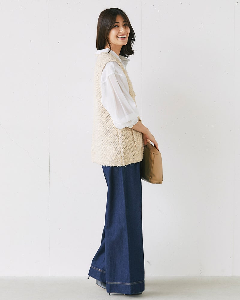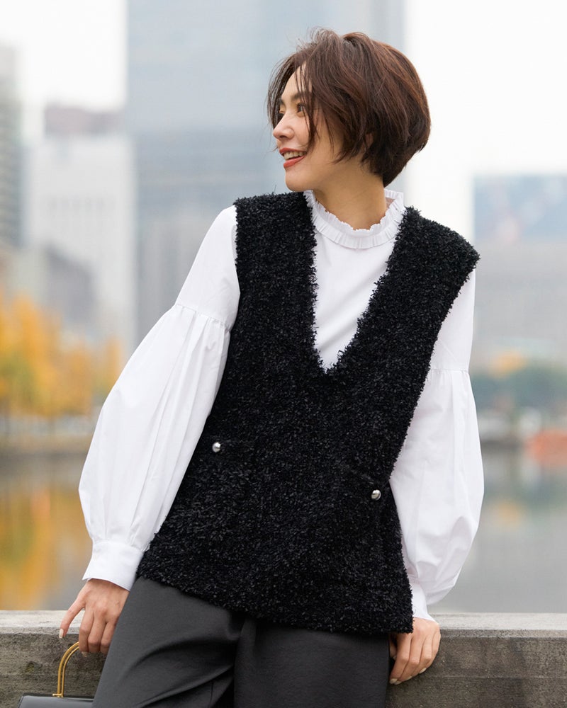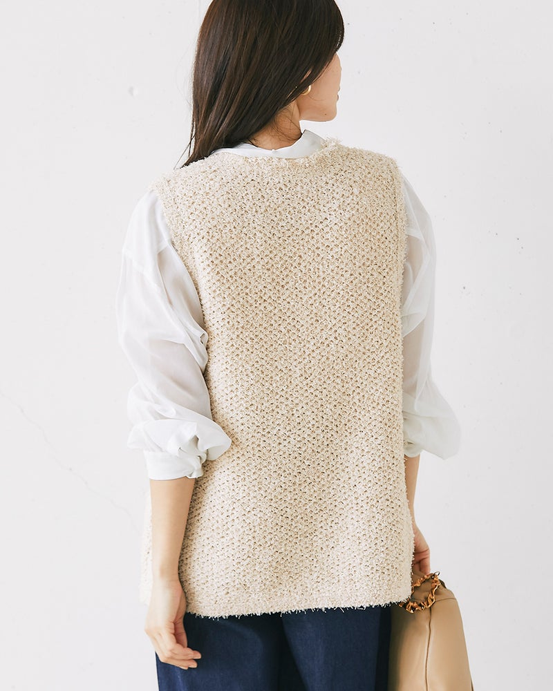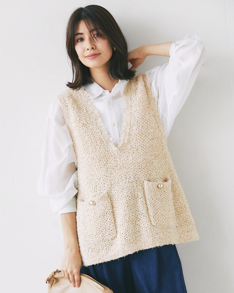 顔まわりをすっきり見せる深Vネックのニットベスト。着回しやすいシンプルなフォルムながら、ツイード調の表情豊かな素材感がコーデを格上げしてくれます。ゆとりを持たせた袖ぐりで、下に着るものを選ばないのも便利。1枚重ねるだけで旬の着こなしが完成します。