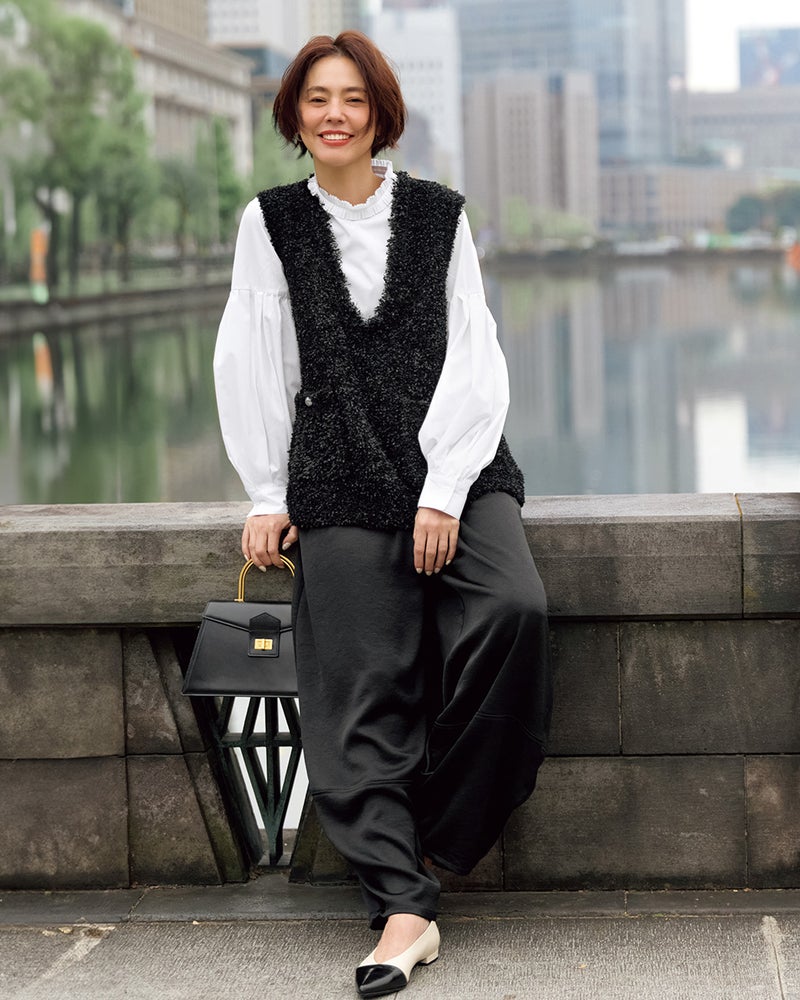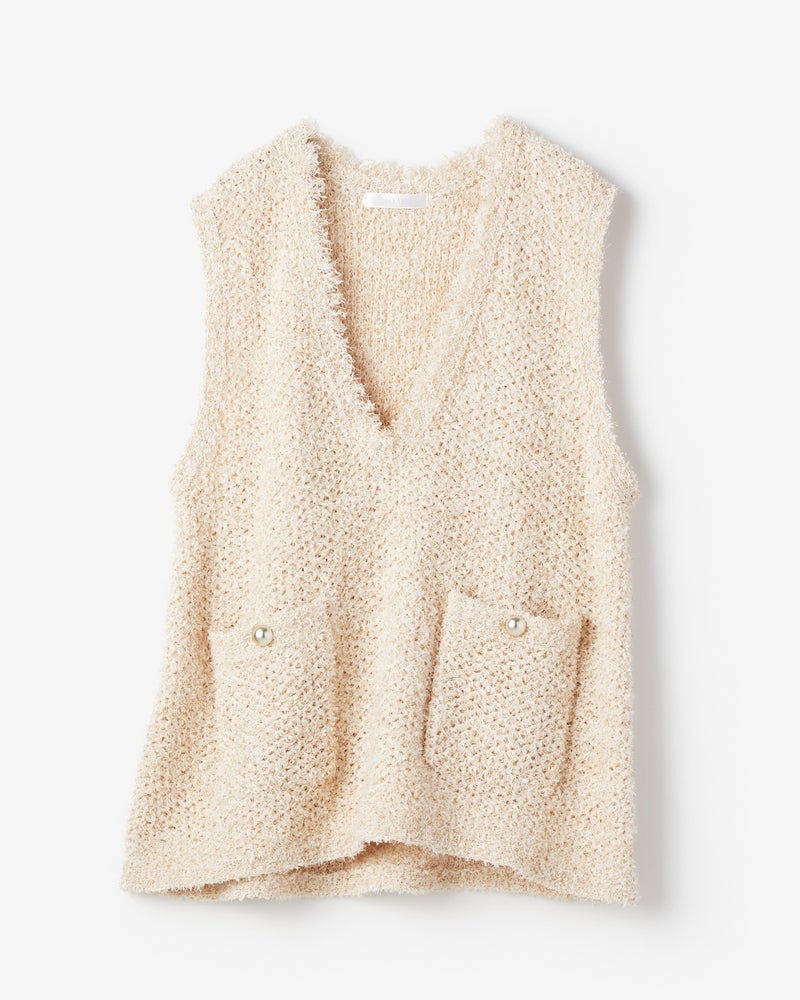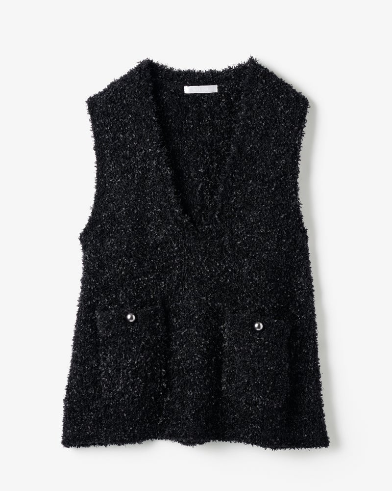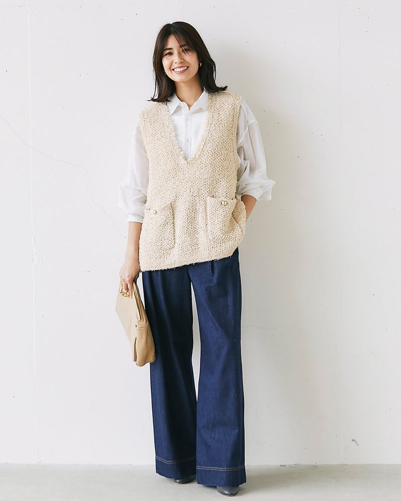 顔まわりをすっきり見せる深Vネックのニットベスト。着回しやすいシンプルなフォルムながら、ツイード調の表情豊かな素材感がコーデを格上げしてくれます。ゆとりを持たせた袖ぐりで、下に着るものを選ばないのも便利。1枚重ねるだけで旬の着こなしが完成します。