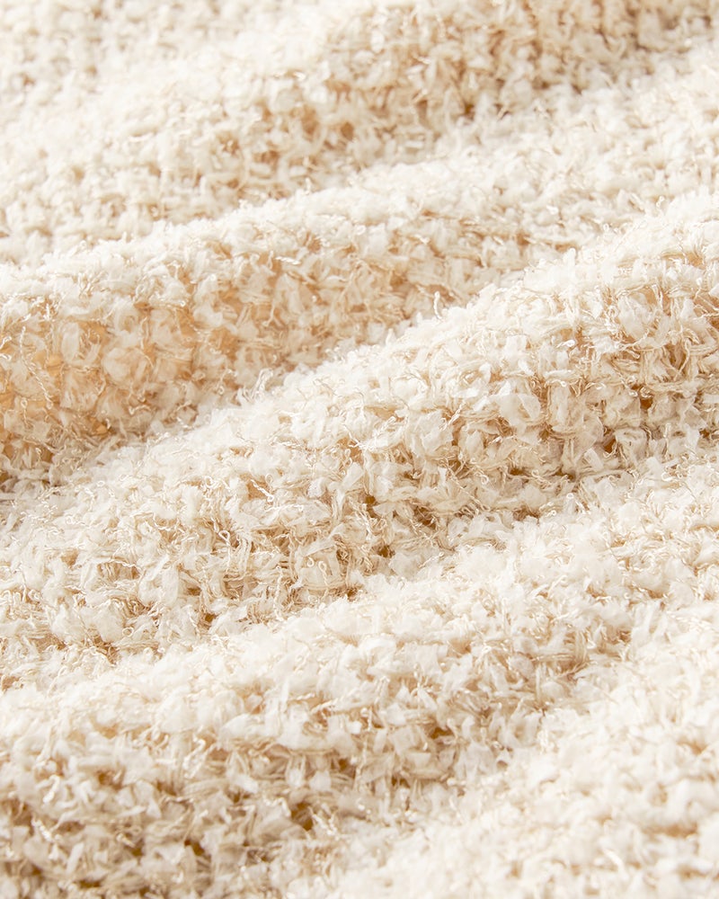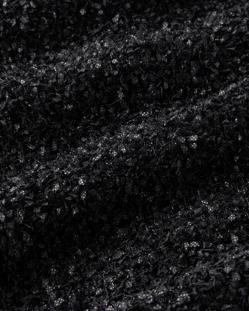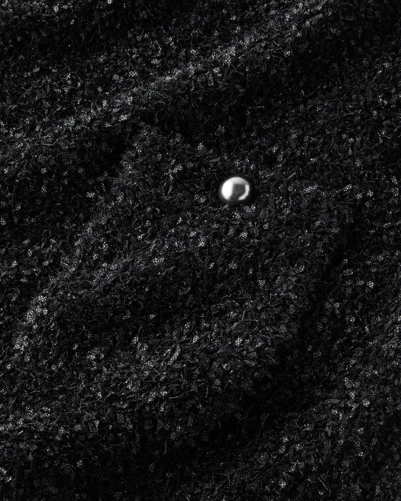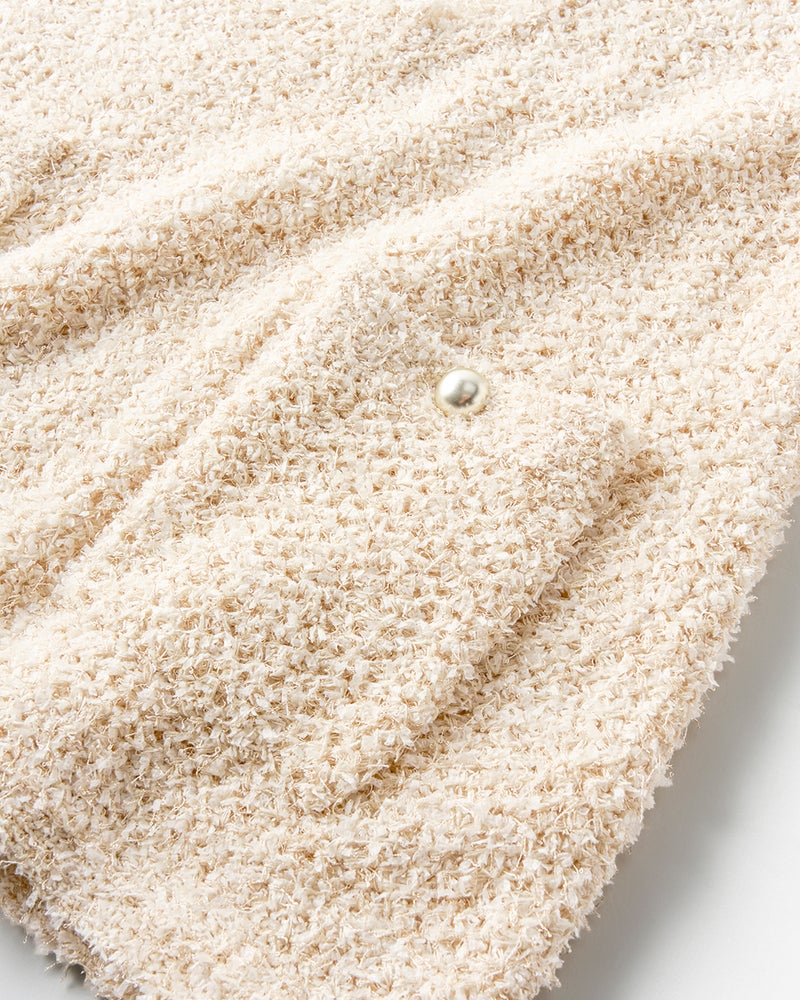 リボンヤーンなど3種類の糸を編み合わせ、ツイード調の立体感を表現。タック編みでほどよい肉感を出し、共布でフリンジをあしらって表情豊かに仕上げました。コロンと丸いメタルボタンも女性らしいアクセントです。