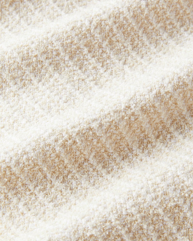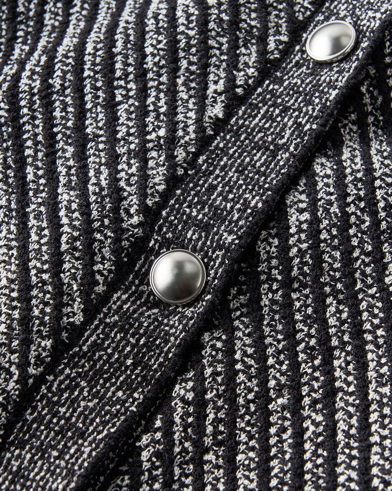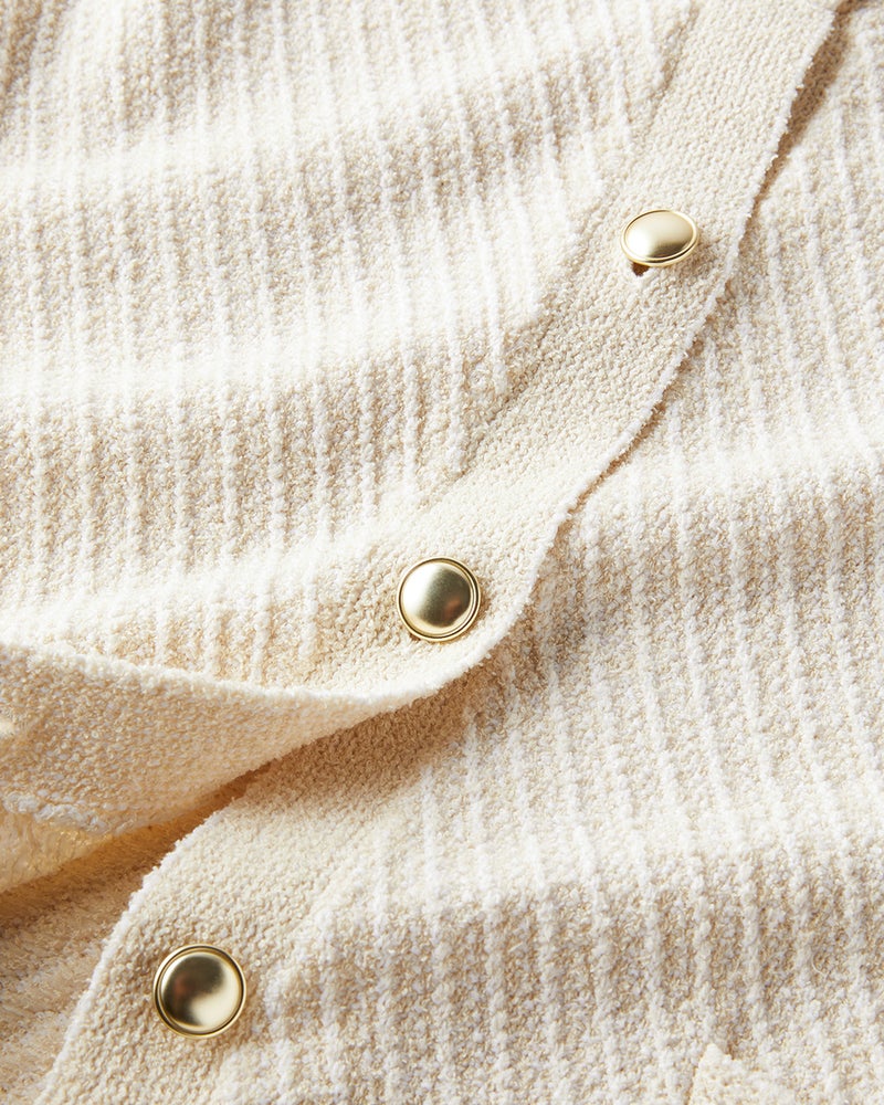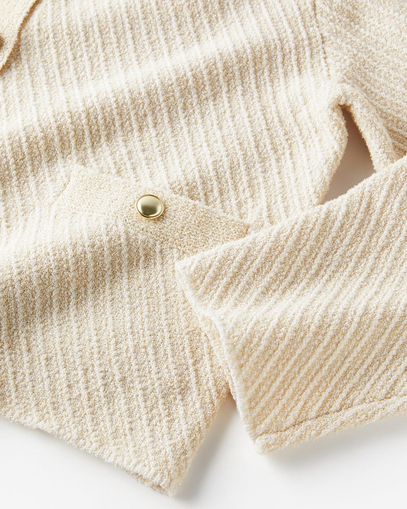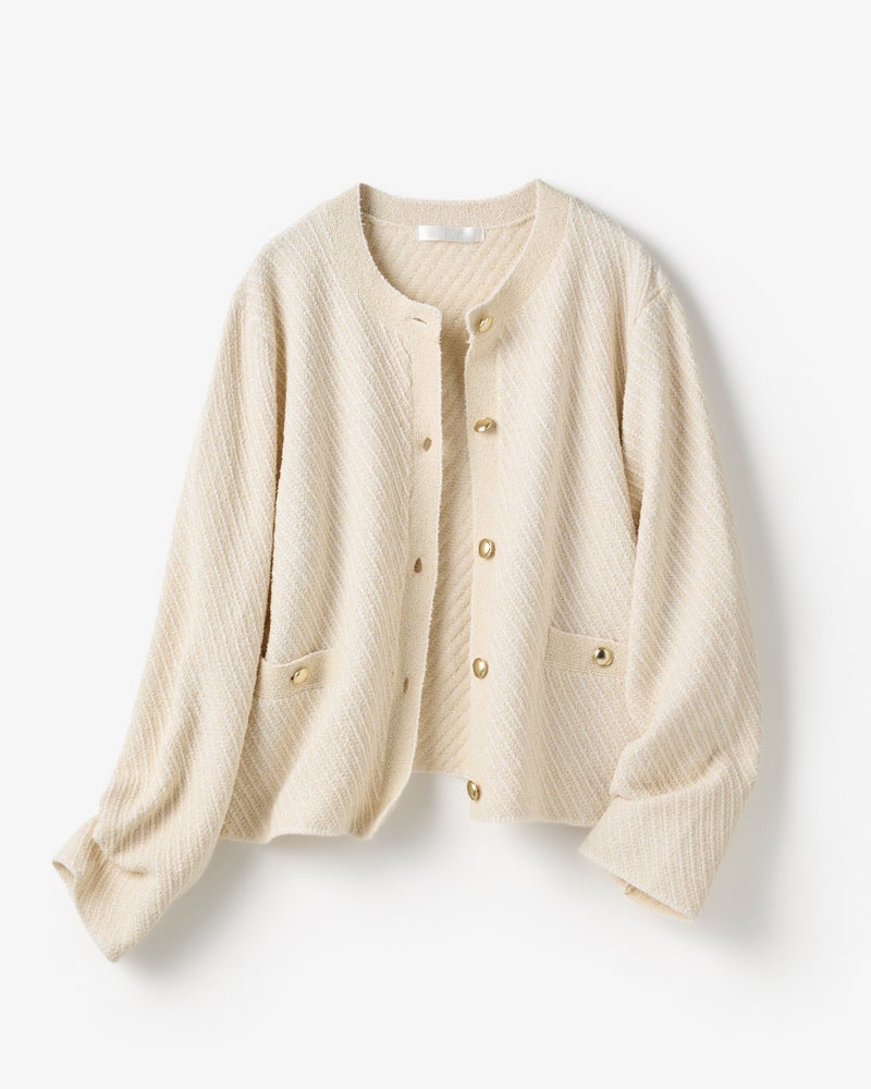 斜めストライプが美しく浮き出るよう、手間ひまかけたタック編みで編み立てました。きちんと感のあるデザインながら、編地の変化でほんのりスパイシーに。メタルボタンもクールな印象を添えています。
