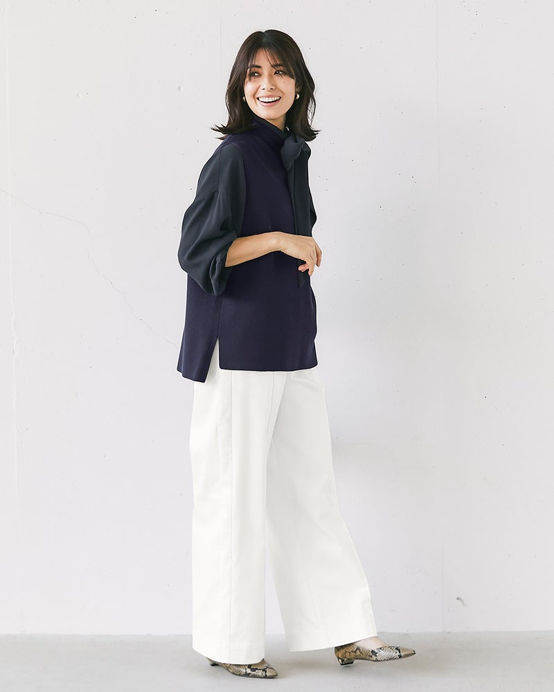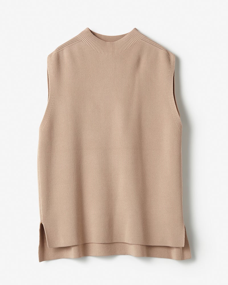 シャツやタートルに重ねたりコートインもしやすいニットベストは、季節の変わり目の温度調節にもぴったりの1枚。ほどよく立ち上がるハイネックと片畦編みならではの縦線で、1枚着るだけですっきりスマートに見えるデザインにこだわりました