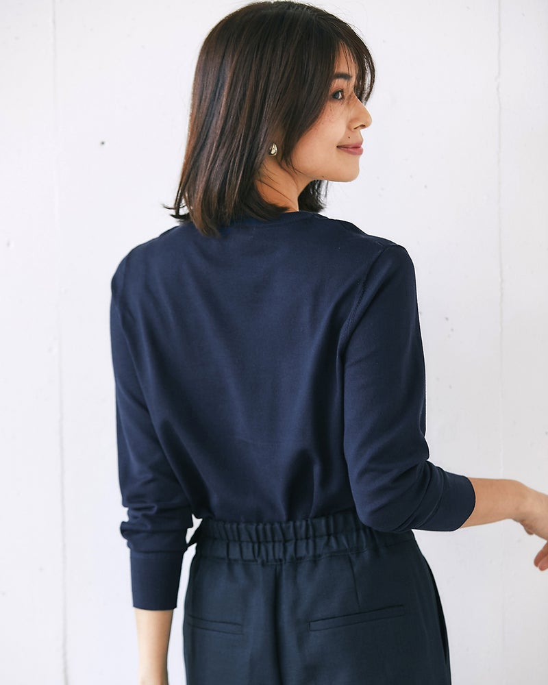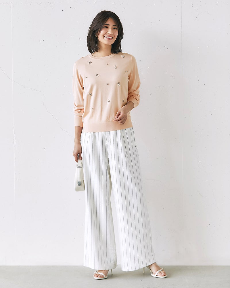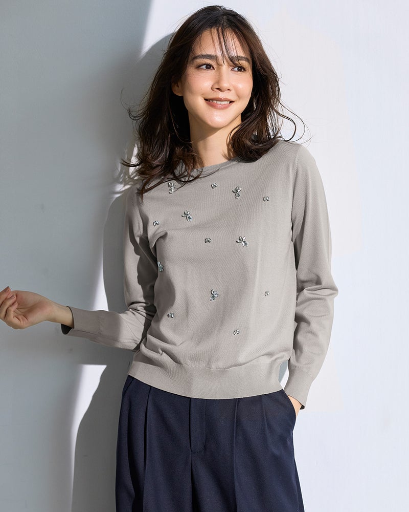 日常でもおでかけ着でも活躍する、クリスタルビジューがきらめくプルオーバーニット。着心地は柔らかくしなやか、なのにシワになりにくい編地で、毎日のように袖を通してもよれた印象が出ません。合わせるアイテムを選ばない、コンパクトなサイズ感です。同デザインのカーディガンとのアンサンブルもおすすめ。