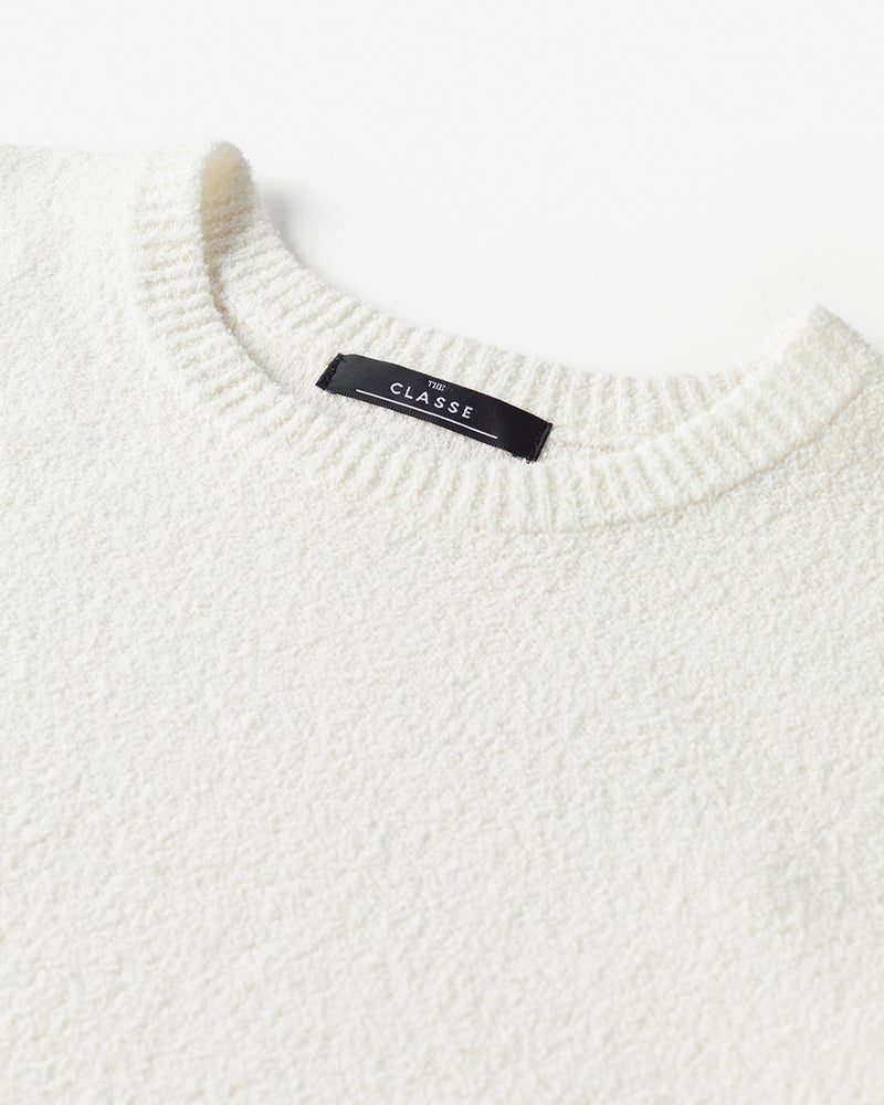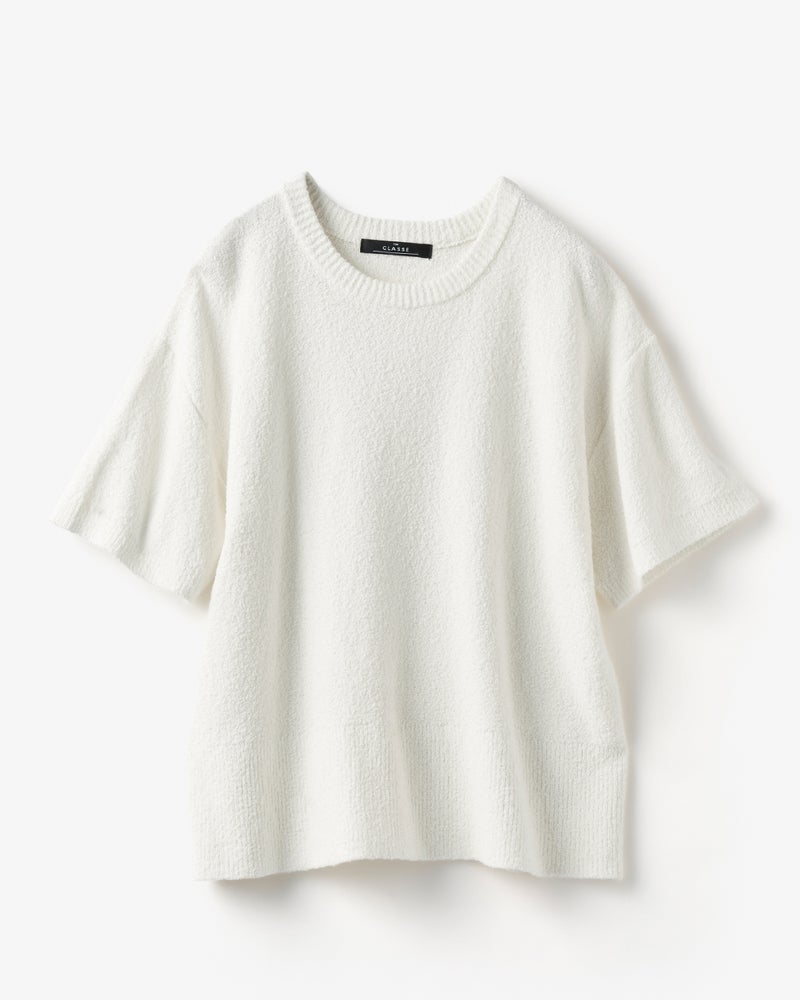 ポコポコした立体編地が印象的なコットンブークレニットで仕立てたプルオーバー。シンプルなボックスフォルムデザインは、Tシャツがわりに1枚着るだけで春のお洒落がぐっと格上げ。