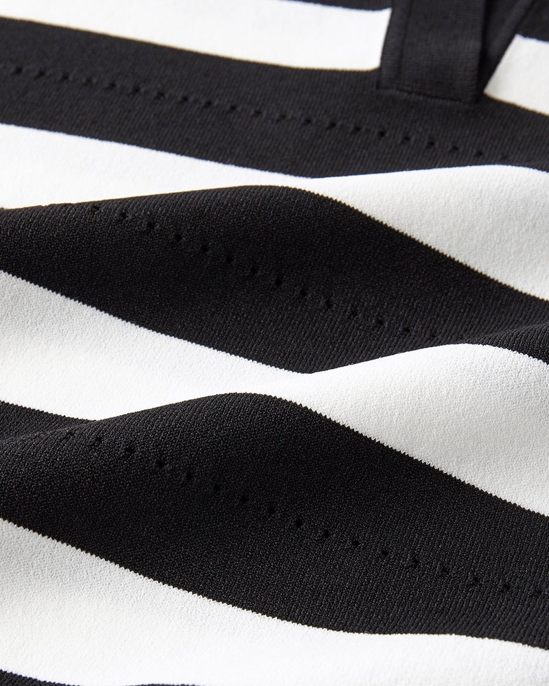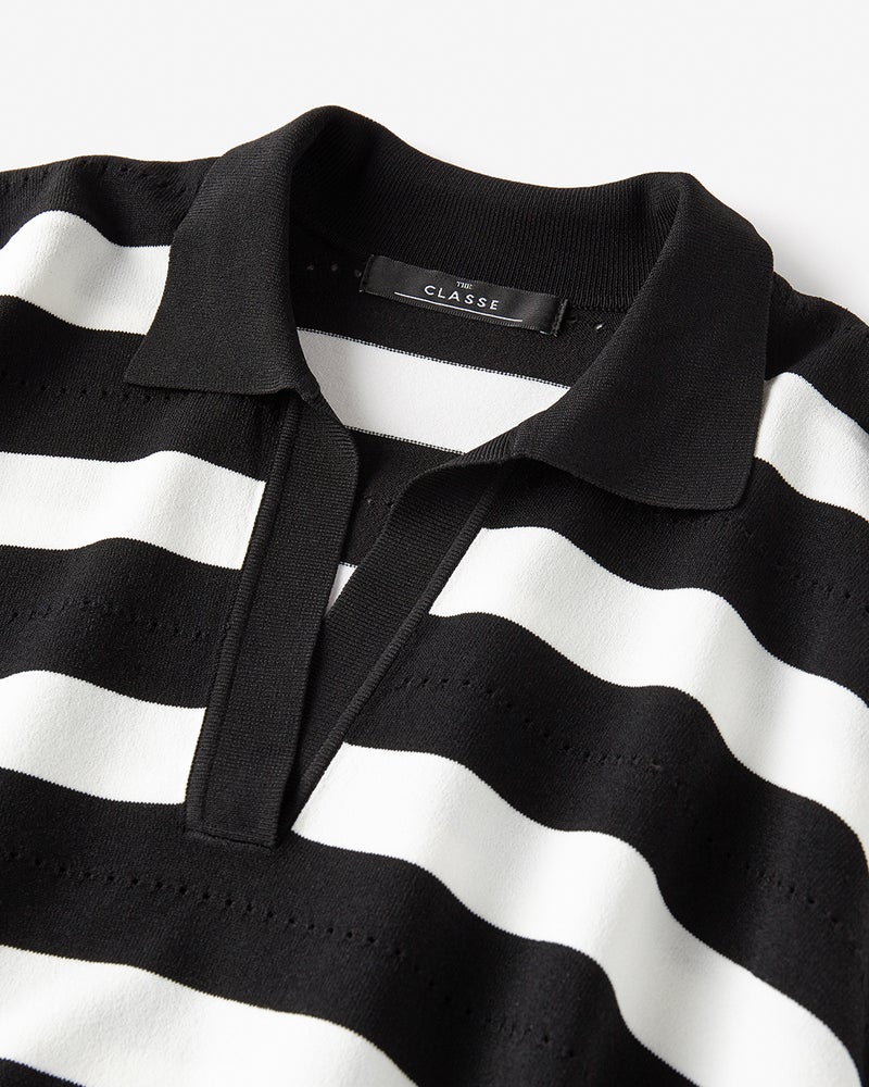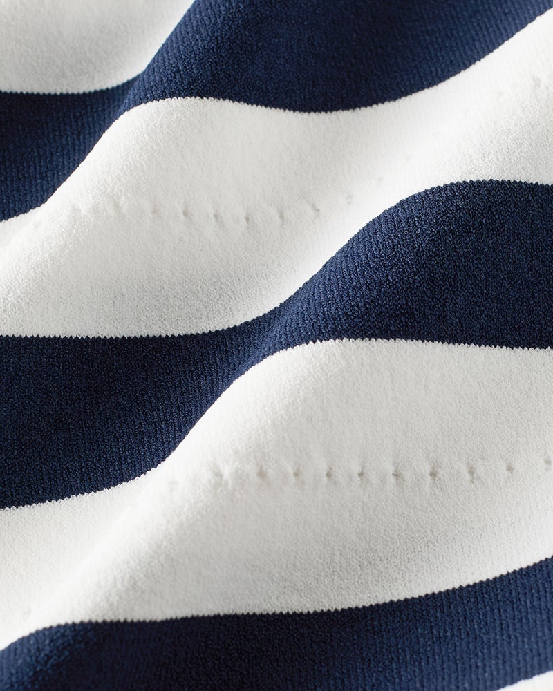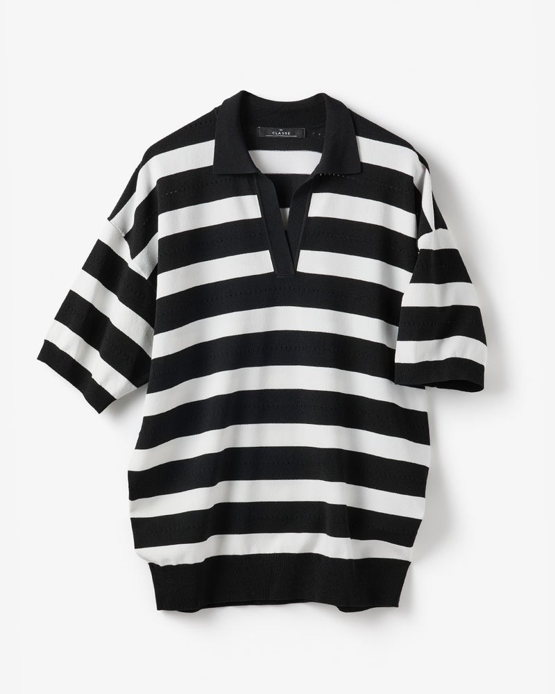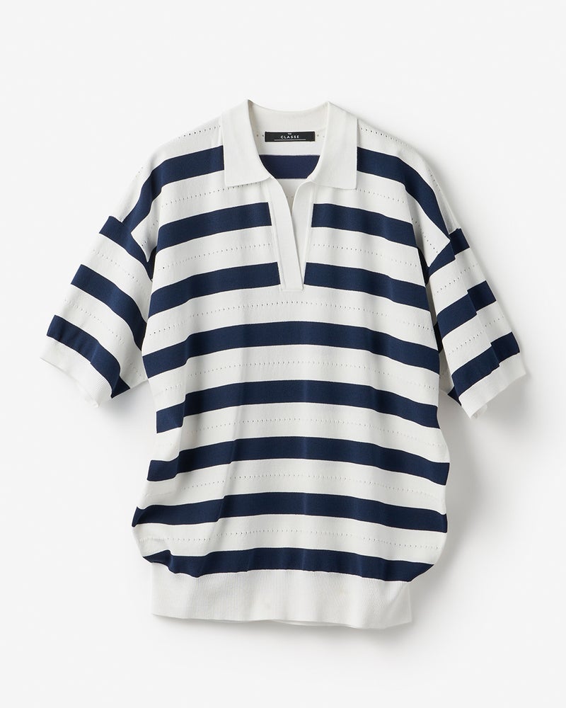 ボーダーポロニットは、上品カジュアルの定番アイテム。肩線を落としたゆったりシルエットで今っぽく着られるデザインに仕上げました。ボーダーの間にアイレット柄を加えることでカジュアルすぎない大人の1着に。