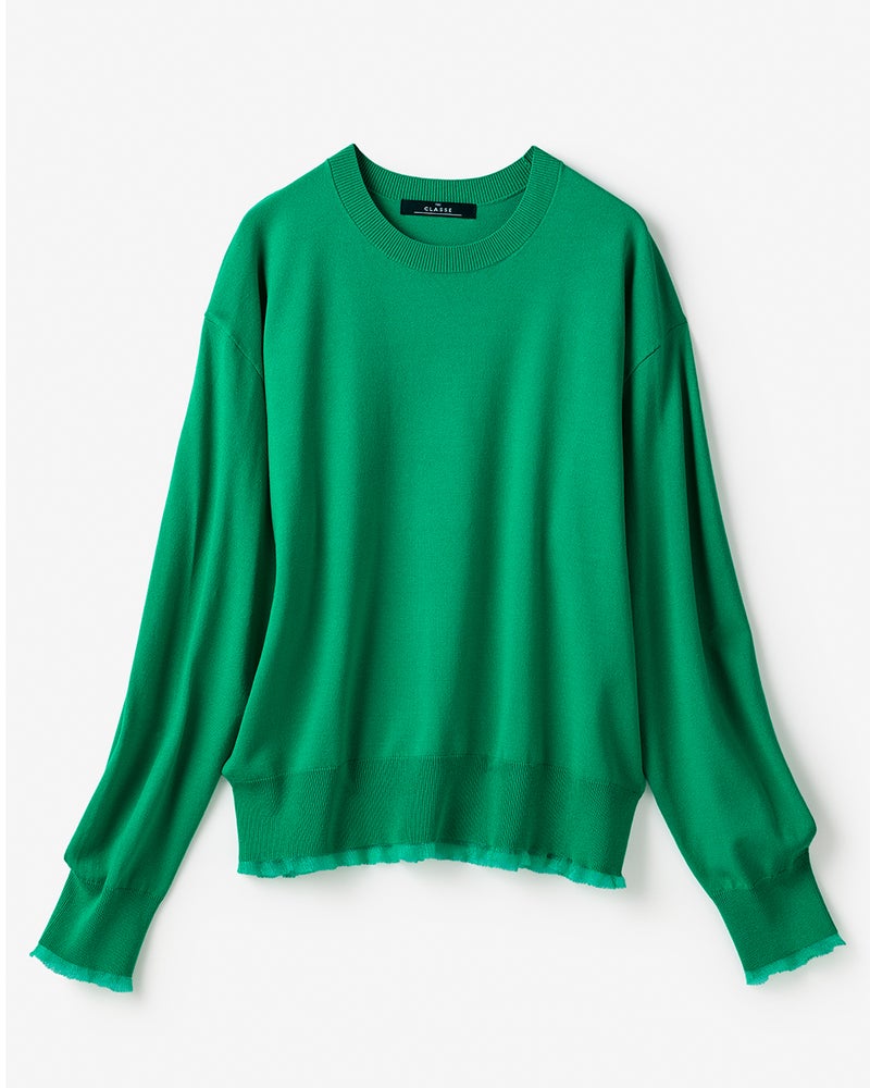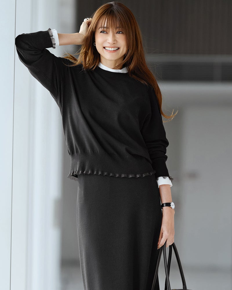 トレンドのシアーディテールをさりげなく取り入れるなら、こんなシアーフリルのニットがおすすめ。ベースは極シンプルなゆったりフォルムのクルーネック、袖と裾に透明糸仕立てのシアーフリルをプラスして品よく華やかに。ハリとなめらかさが共存する中厚ニット素材は体のラインも拾わずすっきりと着こなせます。