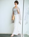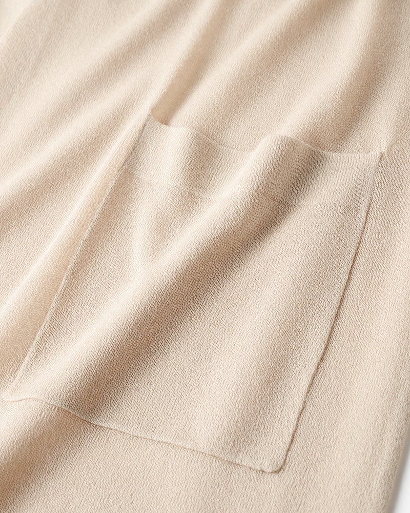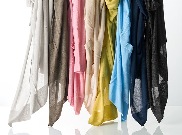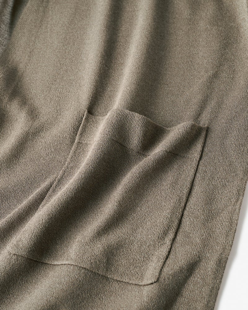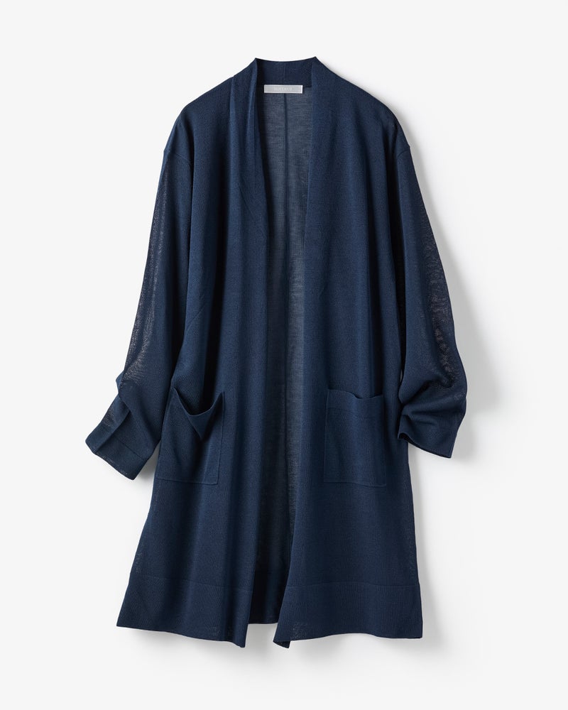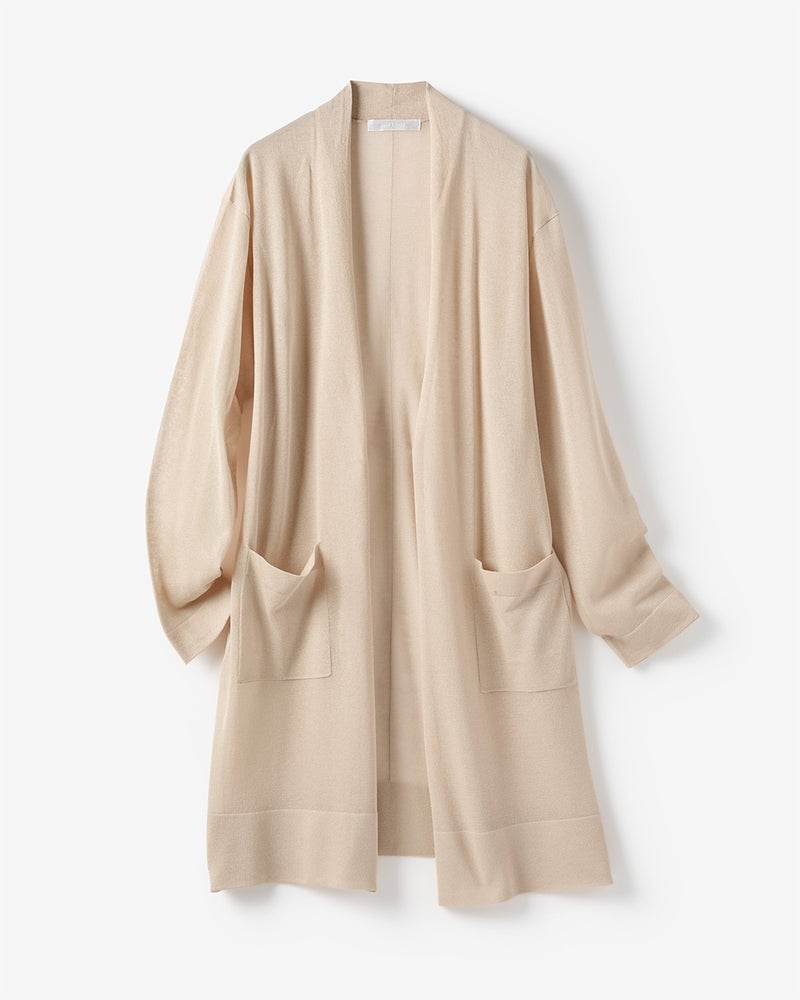 細番手の光沢糸をふんわり甘く編みたてたスパークリングニット素材。大人の肌を美しく見せる艶と透け感が魅力のニットを、さらっと羽織れる着流しカーデに。初夏の気温差や日差し対策をお洒落に叶える人気作を、ファクトリー直接取引のスペシャルプライスでお届けします。