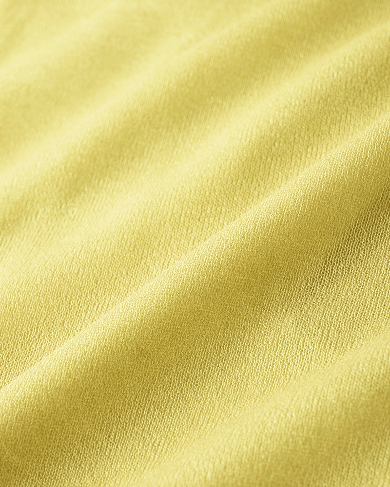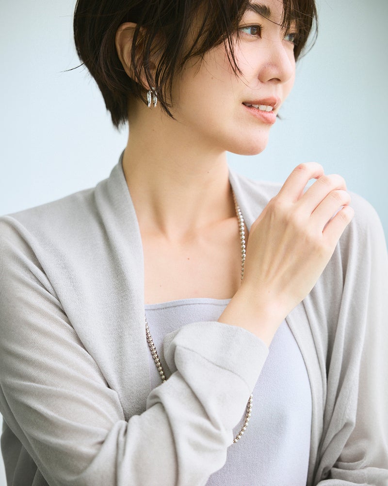細番手の光沢糸を甘く編み立て、ほのかに肌がのぞくシアーな質感がこれからの時期にぴったり。