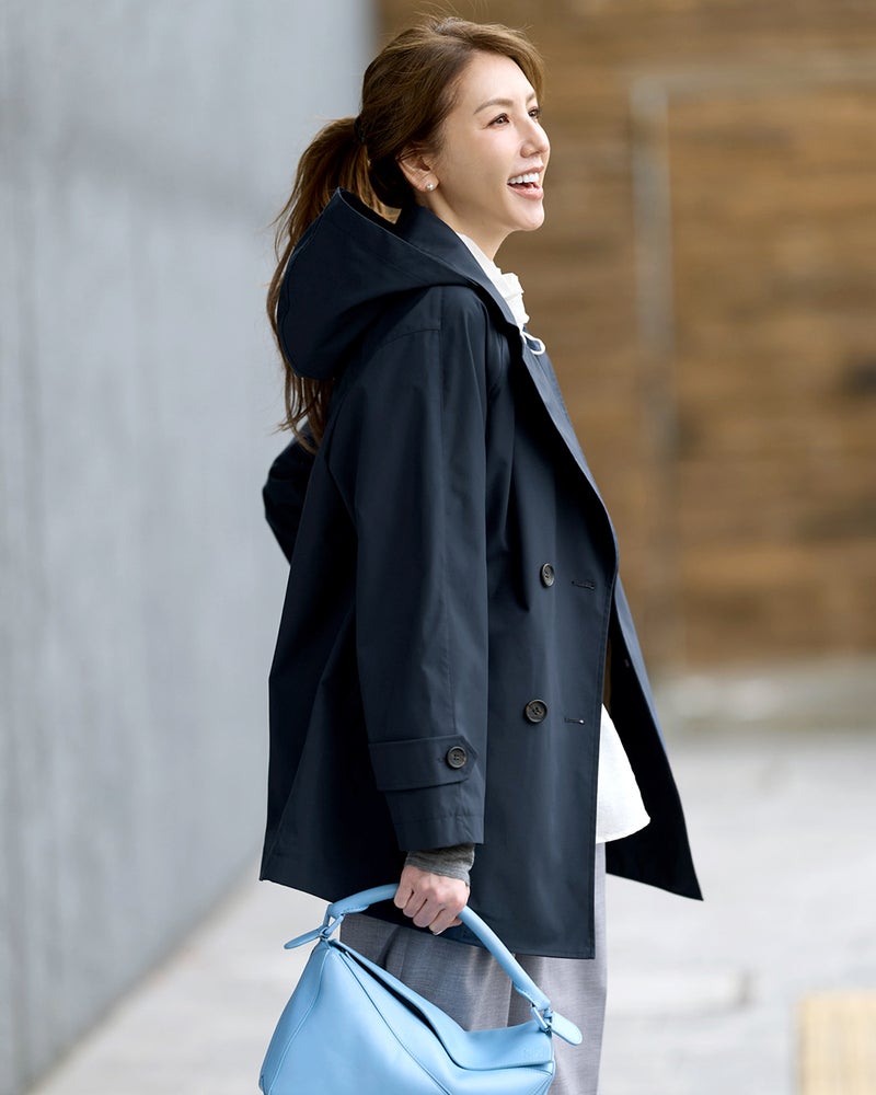 - フードが取り外せる、Pコート風ミドルコートゆったりとしたシルエットが今っぽく洒落見えするフォルム。Pコート風の幅広衿が顔まわりをキュートに彩ります。軽快に動けるヒップカバー丈で、パンツともスカートとも合わせやすいデザイン。大きめのオリジナルボタンもさりげないこだわりです。袖口もベルトでPコート風にデザインしました。