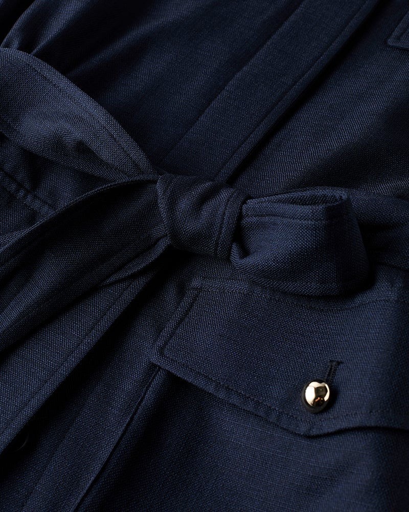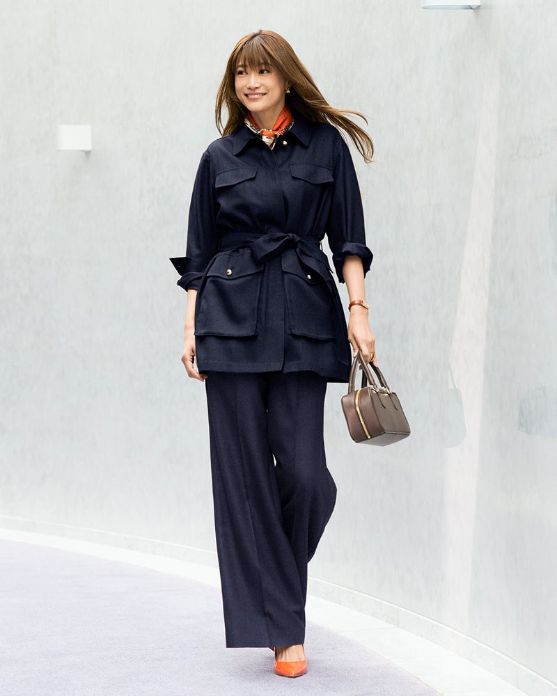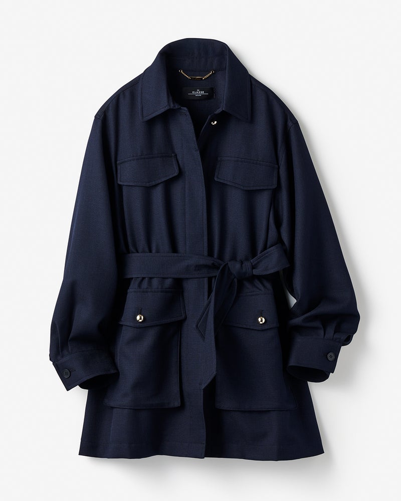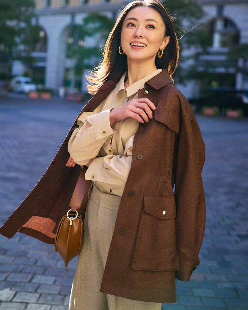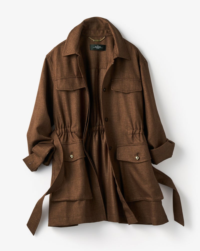 - ベルトの有無で表情一変ロング丈のサファリ風ジャケットは、ばさっと羽織ってカジュアルに、ベルトを締めて女っぽくもシーンに合わせて着こなせるデザイン。