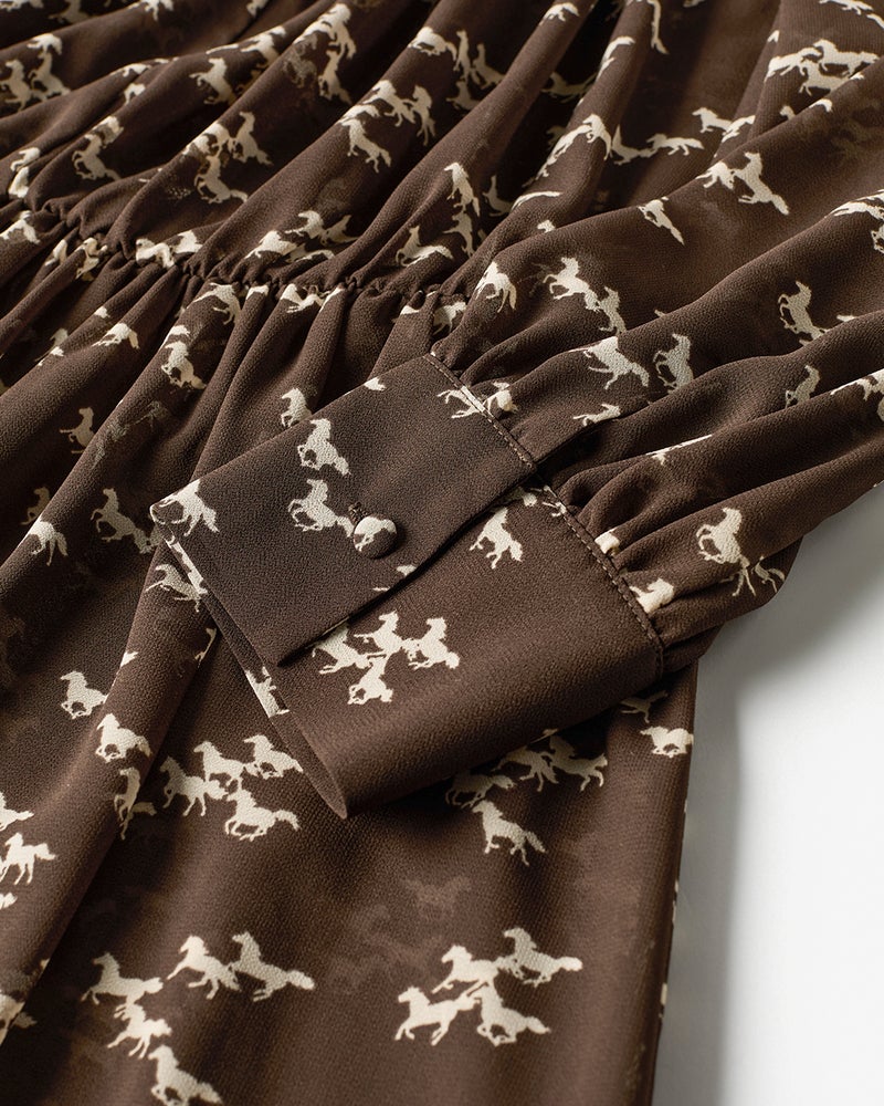 春夏スタイルに欠かせないプリントアイテムは、シックなカラー×モダン柄を選んで洗練された大人の着こなしに。さらさらと風に揺れるシアーシフォン素材に、小ぶりなホース柄を全面プリント。たっぷりとギャザーを効かせたAラインワンピースは、胸元のリボンが大人可愛い雰囲気。色と柄の辛口効果で、甘すぎない大人のシフォンワンピに仕上げました。