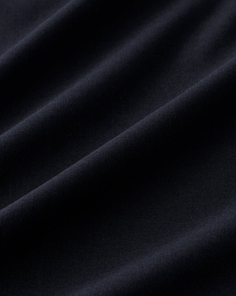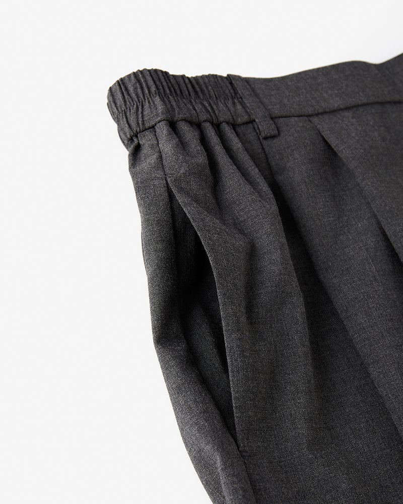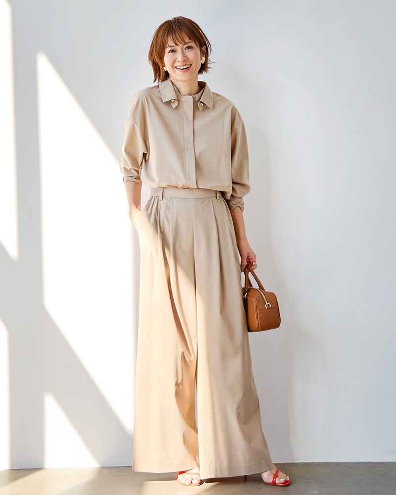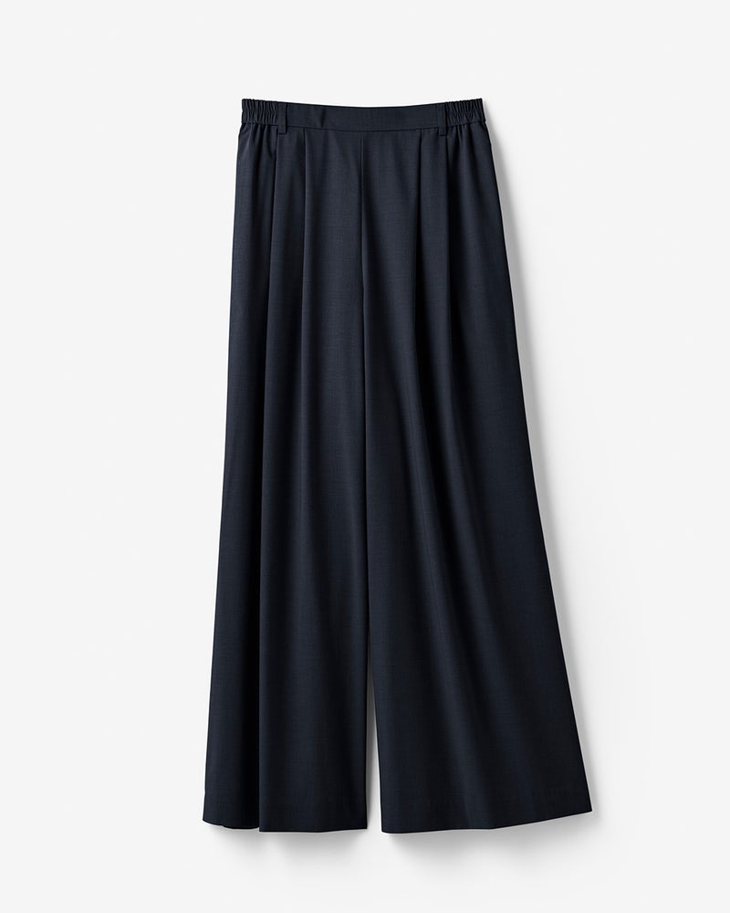 なめらかな光沢とドレープ感で、薄手ながら上質に見えるサマーウール調素材。体のラインを拾わないタックワイドパンツも、とろんと落ちる独特のドレープ感でボリュームを感じさせずすっきりスマートに。