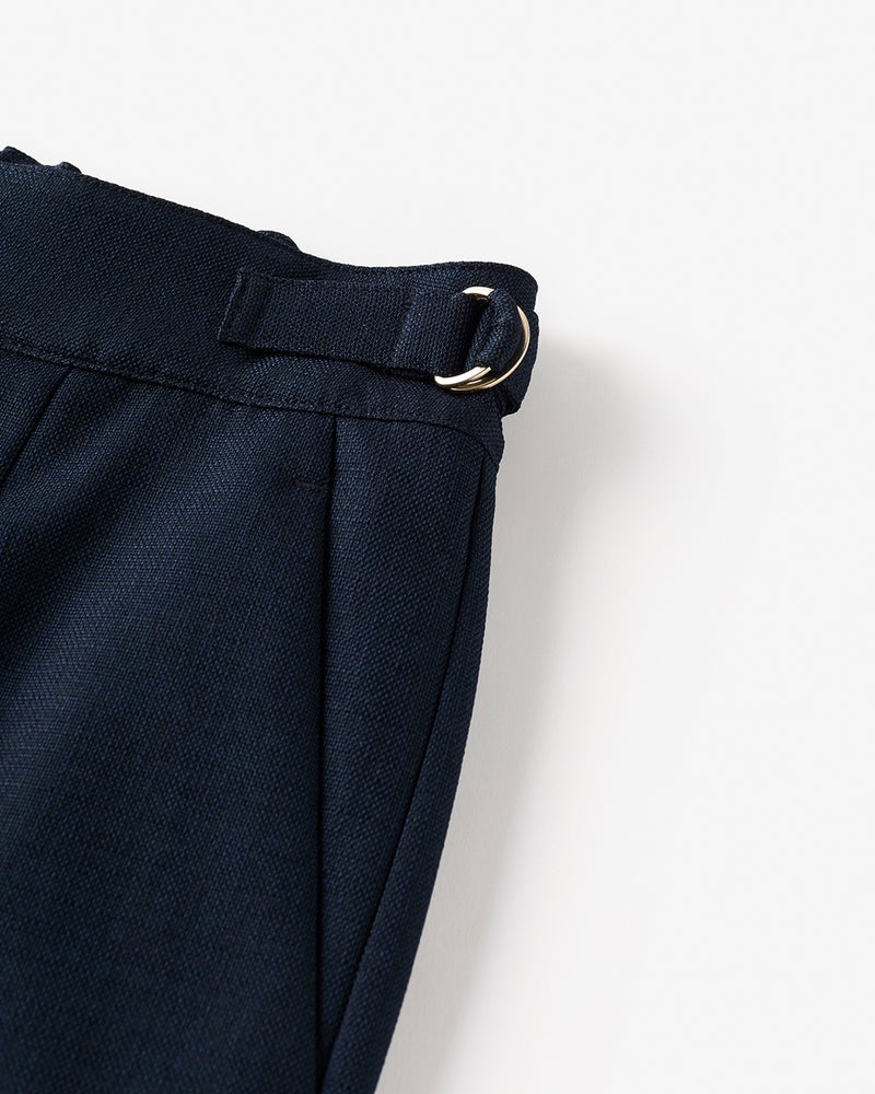 リネンタッチな風合いをシワになりにくい機能性素材で実現したブッチャー織りのワイドパンツ。両ウエストサイドにタブベルトを配したグルカ風デザインは、ウエストインしてもお洒落な雰囲気。後ろウエストゴム入りではき心地も抜群。同素材のジャケットとのセットアップもおすすめです。