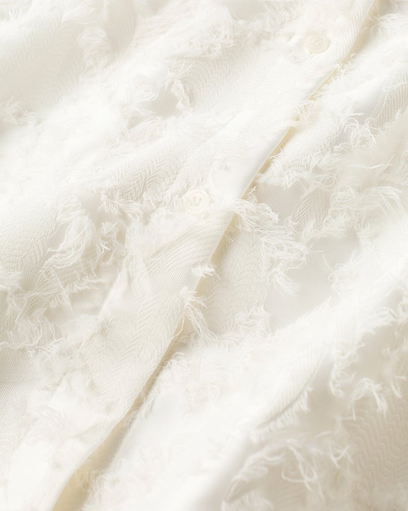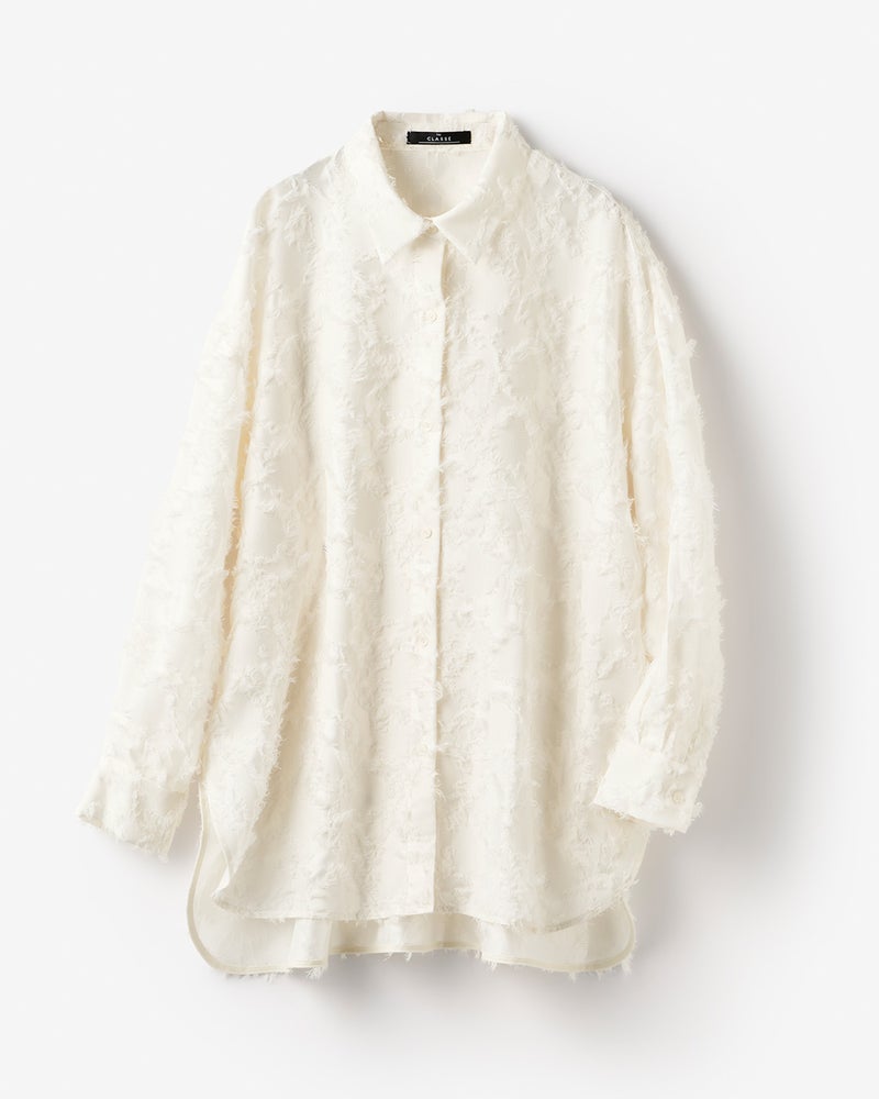 ふわふわと揺らめくカットジャカードを使い、シンプルながらも目を引く一着に仕立てたシャツ。ヒップまで隠れるゆったりとしたシルエットで、一枚ではもちろん羽織りとしても大活躍。生地もほどよく厚みを持たせ、白でも透けにくいのも優秀です。