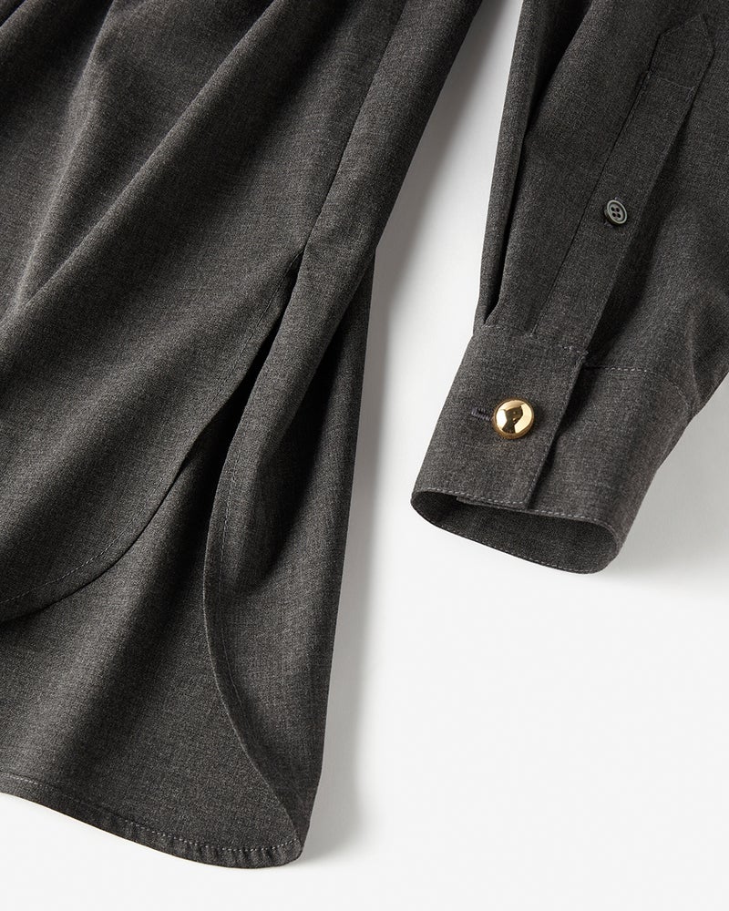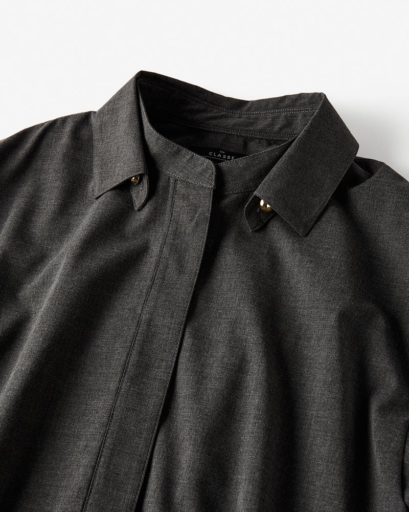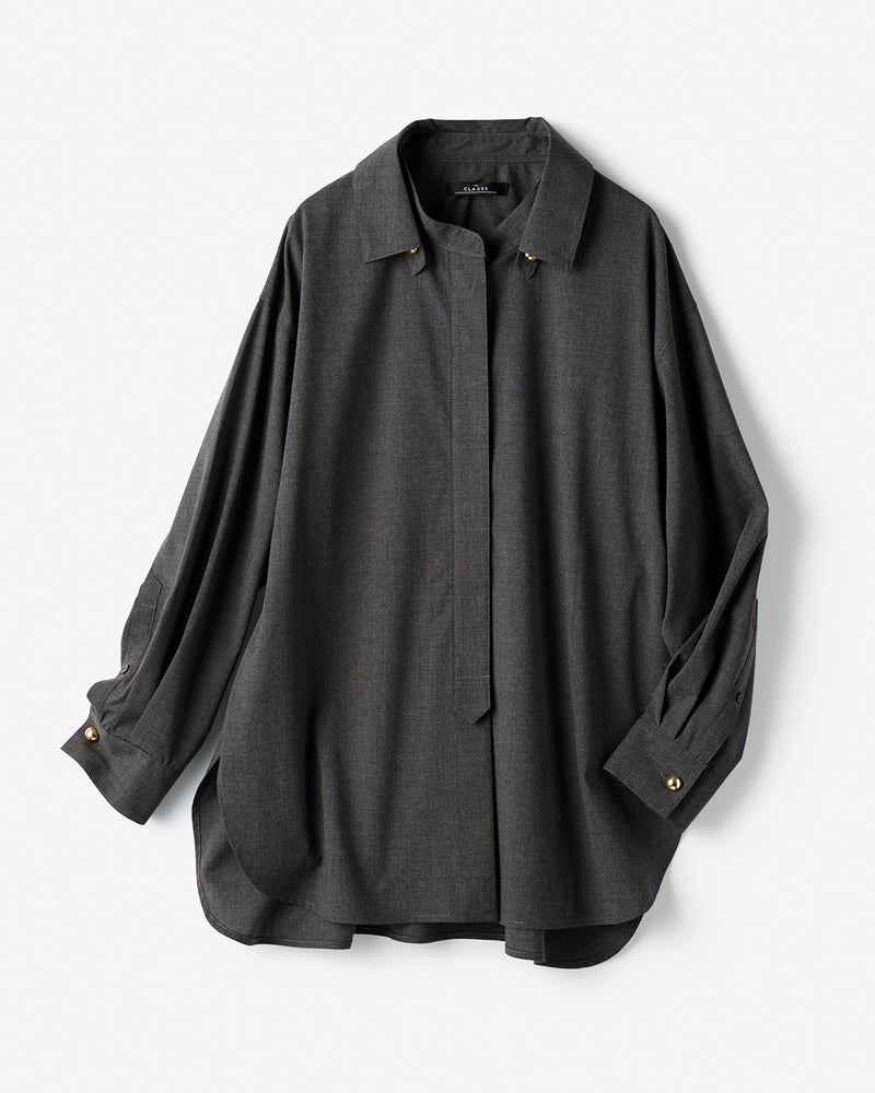 ゆるっと身体が泳ぐようなフォルムのシンプルデザイン。衿もとの金ボタンが洒落たアクセントに。
