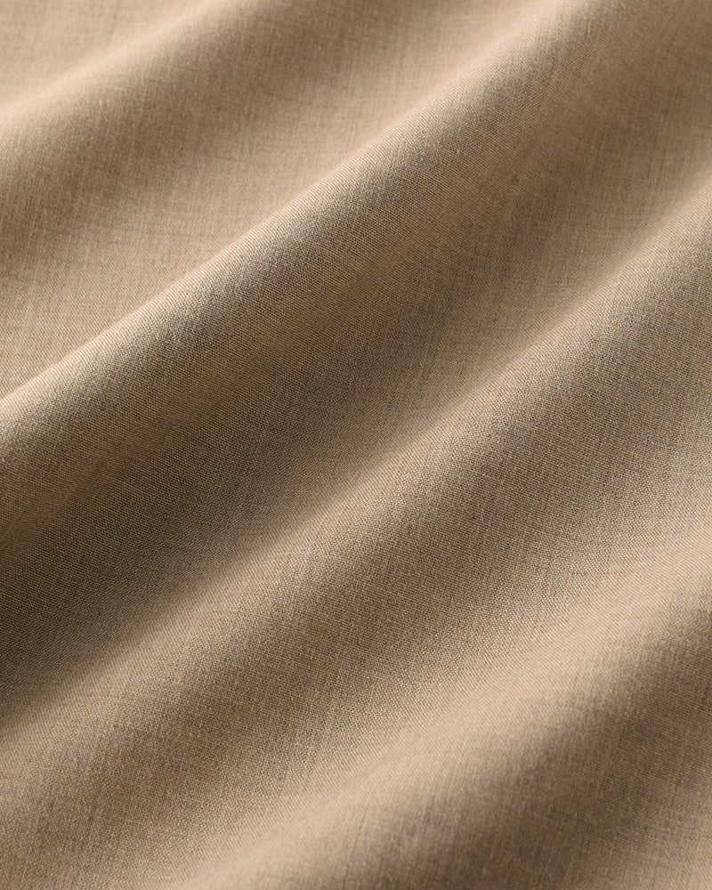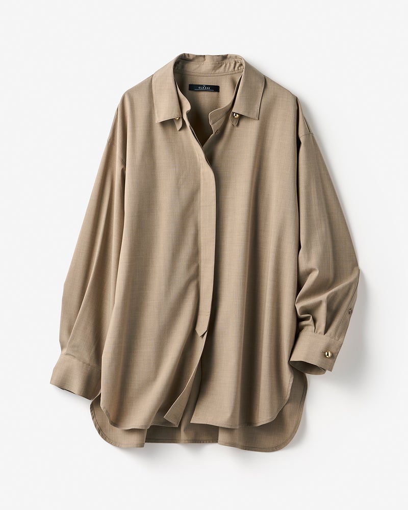 定番アイテムだからこそアップデートしたいシャツの着こなし。なめらかな光沢とドレープ感を持つサマーウール調素材で、ゆるっとこなれた雰囲気で着こなせるオーバーサイズシャツに仕立てました。