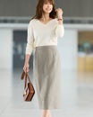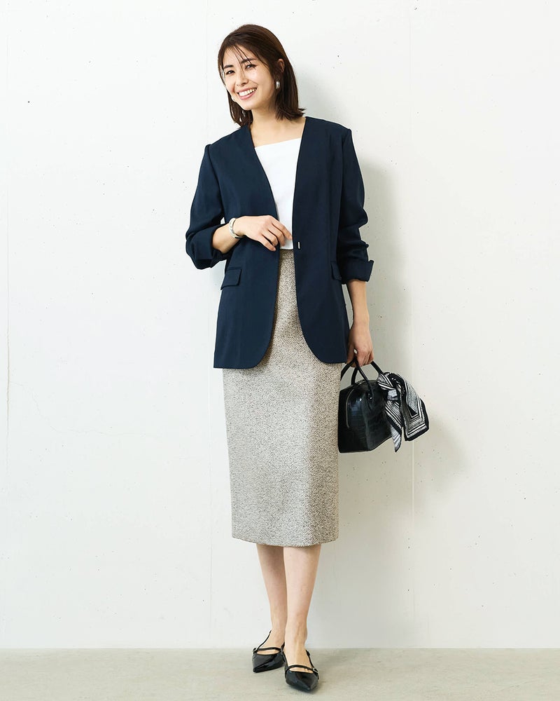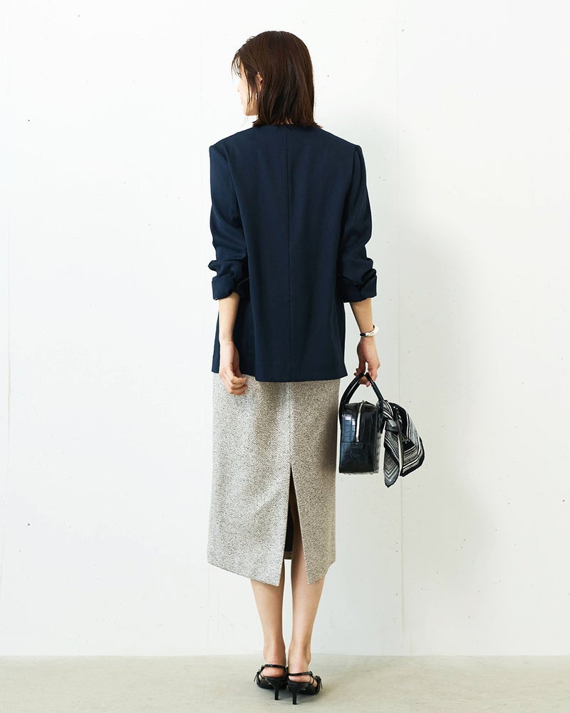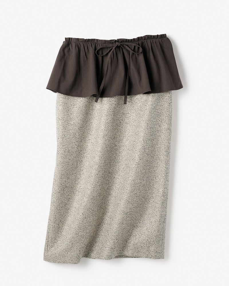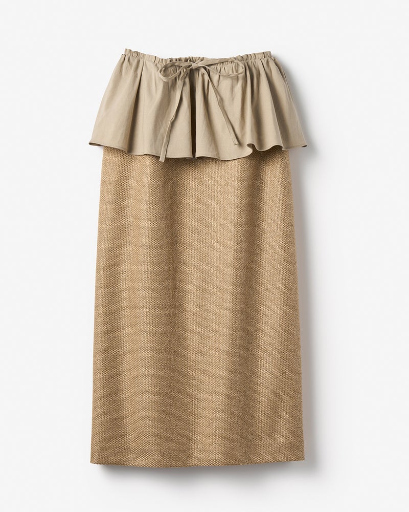 ツイードのような贅沢な表情を、コットンの軽やかさで叶えたコットンバスケット素材。どんな体型もすらりスマートに見せるストレートスカートは、つけ外し自在のペプラムディテールで遊びの効いたデザインに。同素材のジャケットとのセットアップならオケージョンにもぴったり。