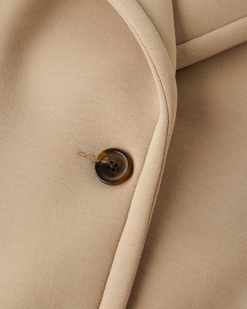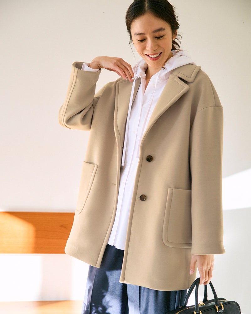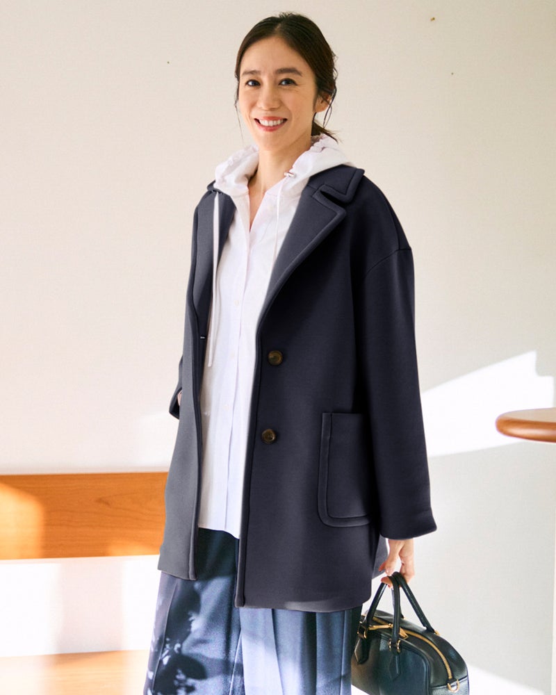シングルのテーラードジャケットをベースに、肩を落としたゆったり洒落見えフォルムに仕上げました。ヒップラインをカバーする長め丈で、中に厚手のニットも重ね着できるので、寒い時期も着回していただけます。