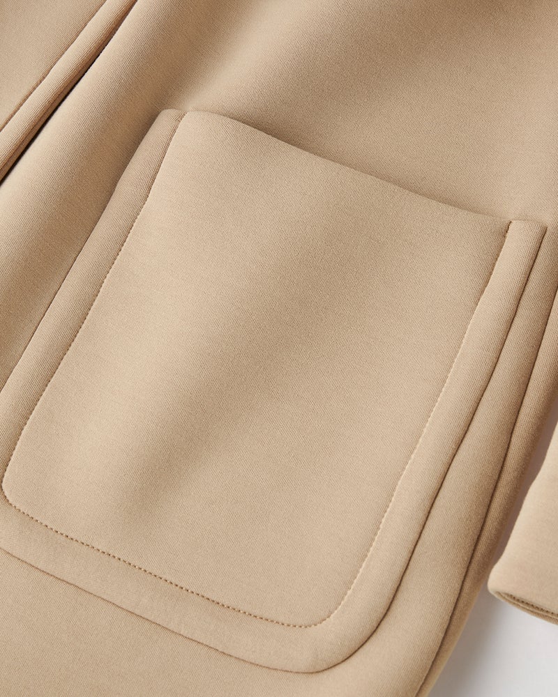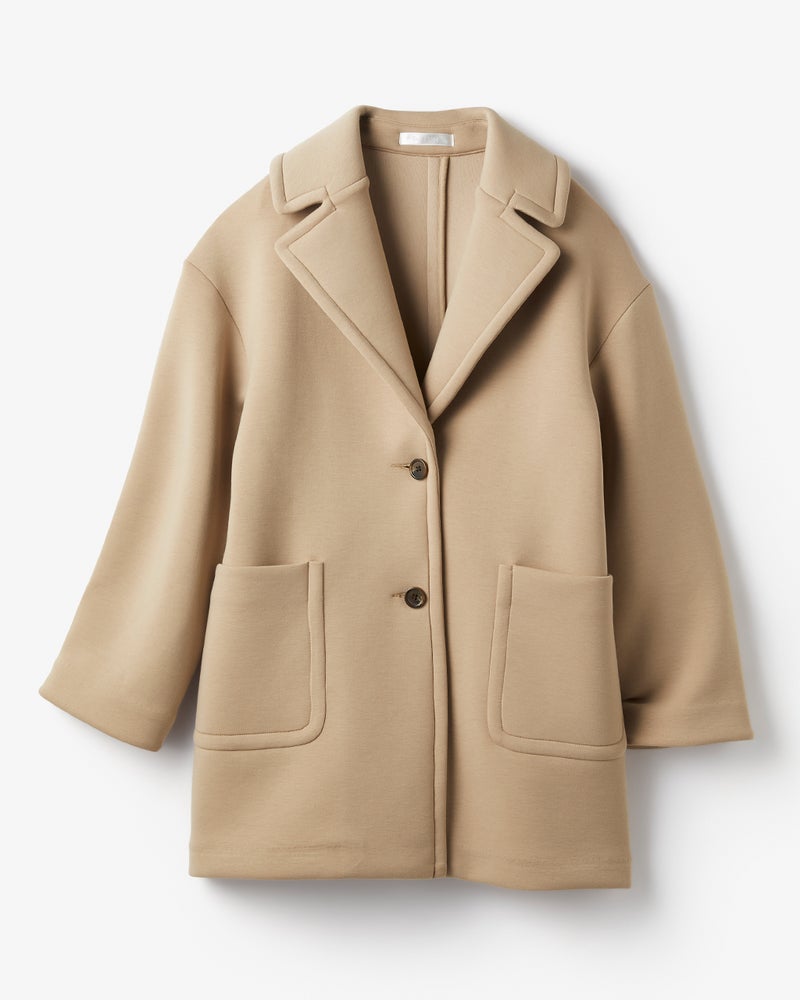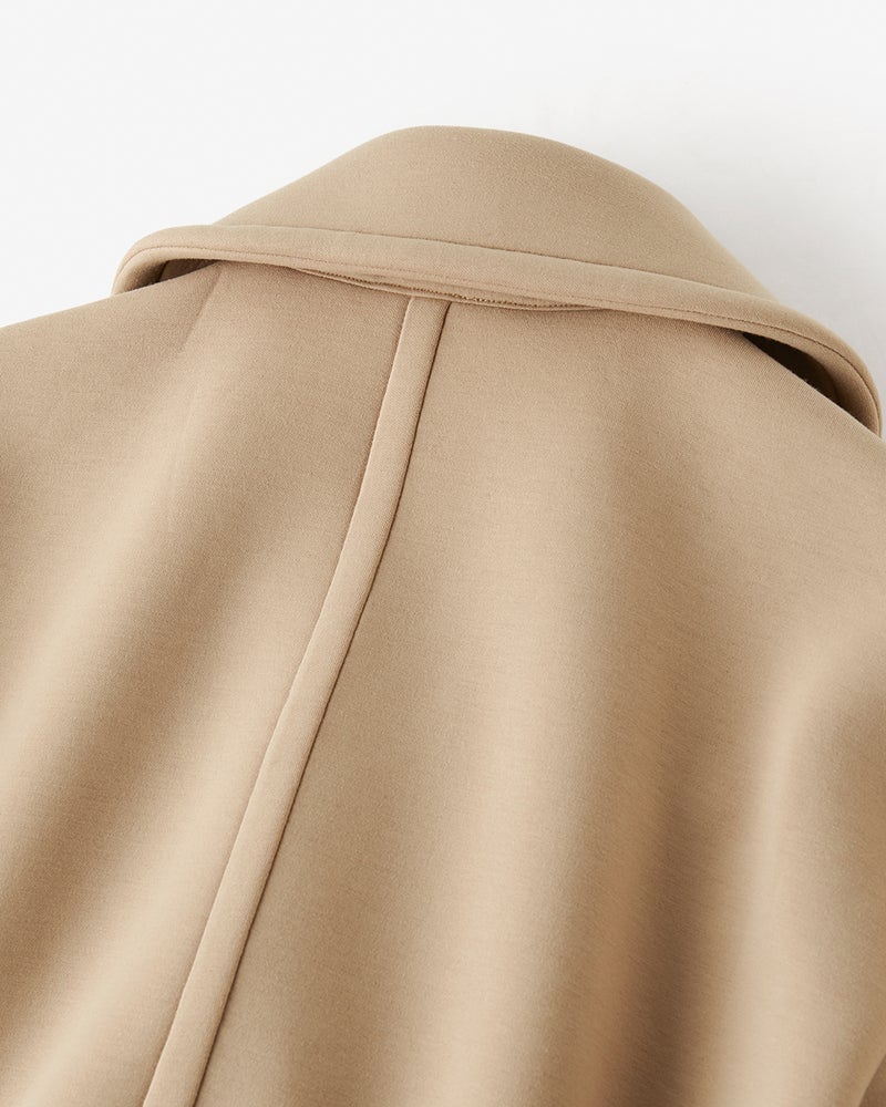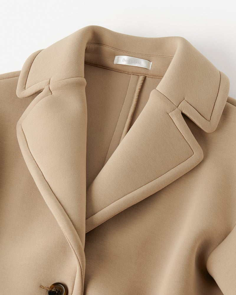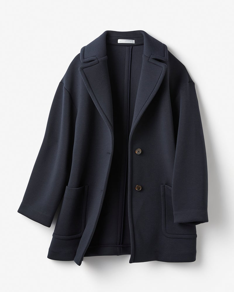 ジャケットより暖かく、コートより気楽に羽織れて洒落見えすると、ここ数年で人気が定着したジャケット+コート=ジャコット。そんな旬のジャコットを、ダンボール構造の軽くハリのある光沢カットソーでおつくりしました。