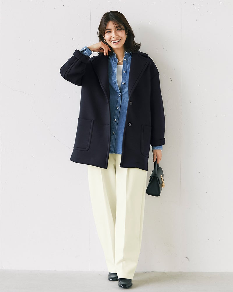 - 大きめ衿が顔印象を華やげて、ぬくもりもしっかりキープ幅広の衿にステッチを効かせて顔まわりを華やかに。衿の後ろを高くすることで首もとのぬくもりもしっかりキープします。