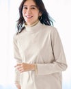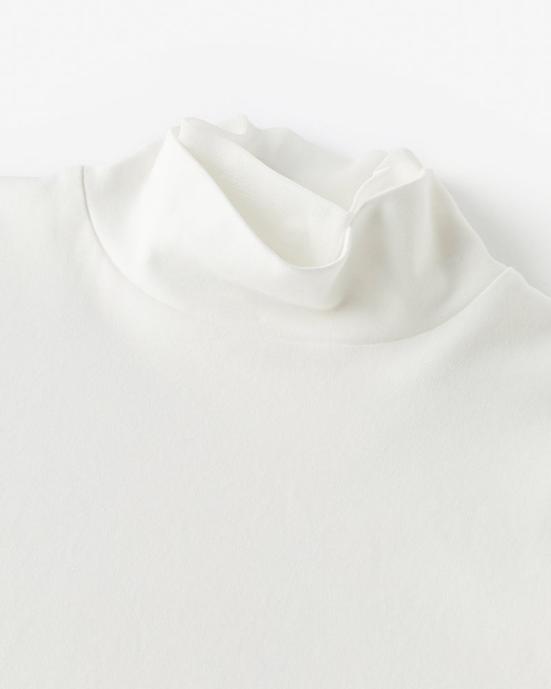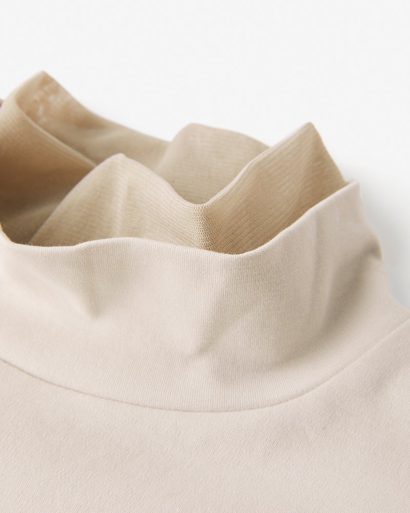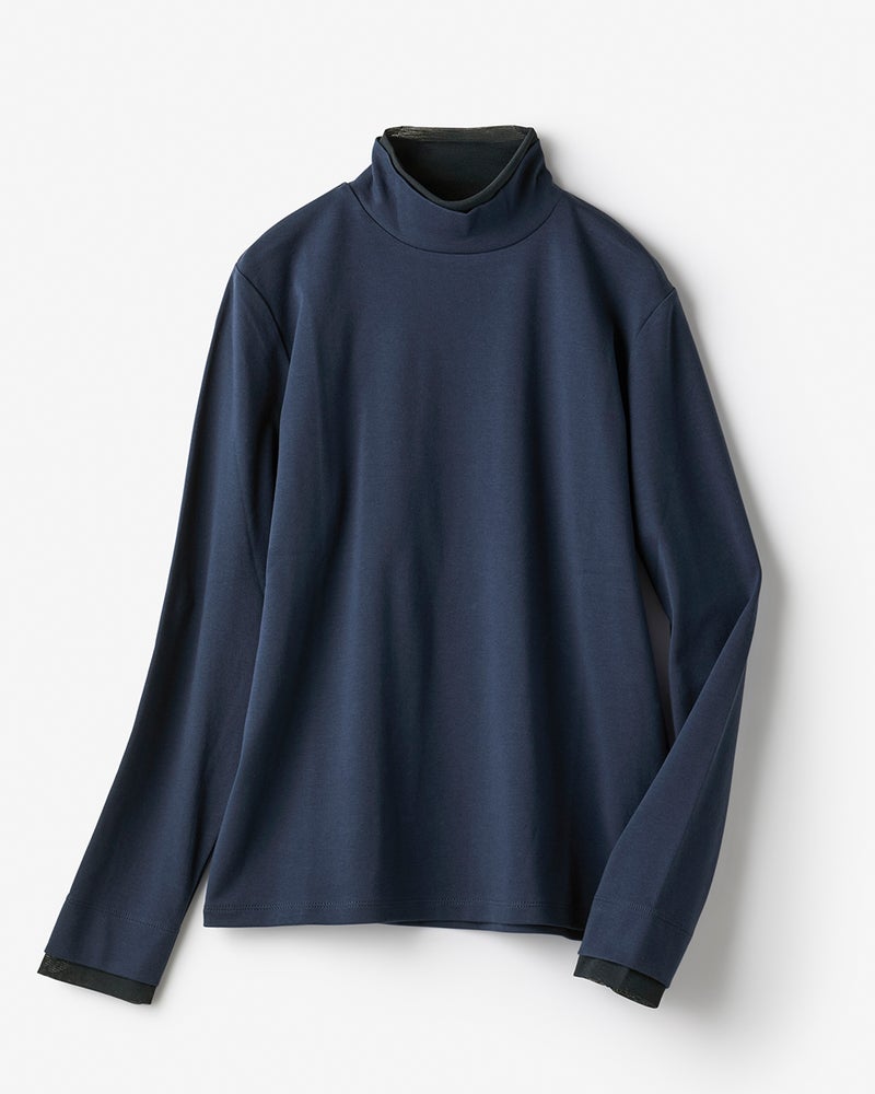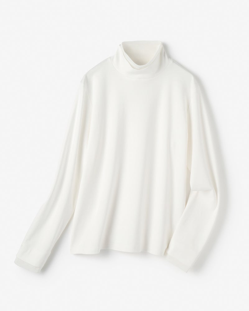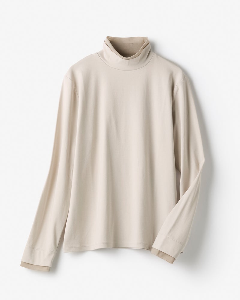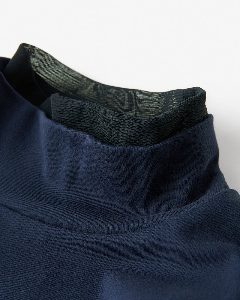 すっと立ち上がるシンプルなハイネックをベースに、ネックと袖口に透けるチュール素材を重ねた洗練の1着。ワンポイントのシアー使いが着こなしを印象的に。