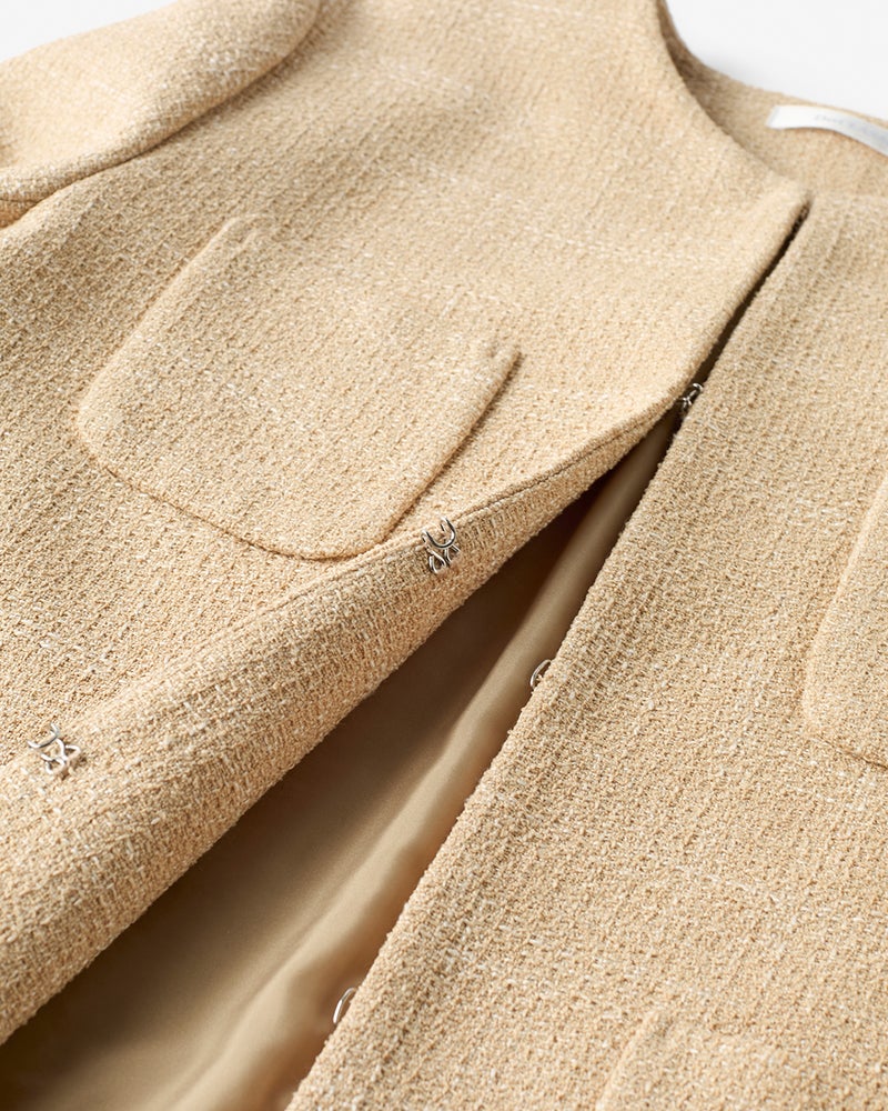 - エレガントでモダン、羽織るだけでコーデを格上げするジャケットきちんと感がありながら女性らしいノーカラージャケット。背面の切り替えが背中をすっきり見せ、胸もとと腰のポケットは顔まわりを華やげつつ、重心を高く見せるのにも一役買っています。表に縫い目の見えない上品な仕上がりは、高度な縫製技術のなせるワザ。