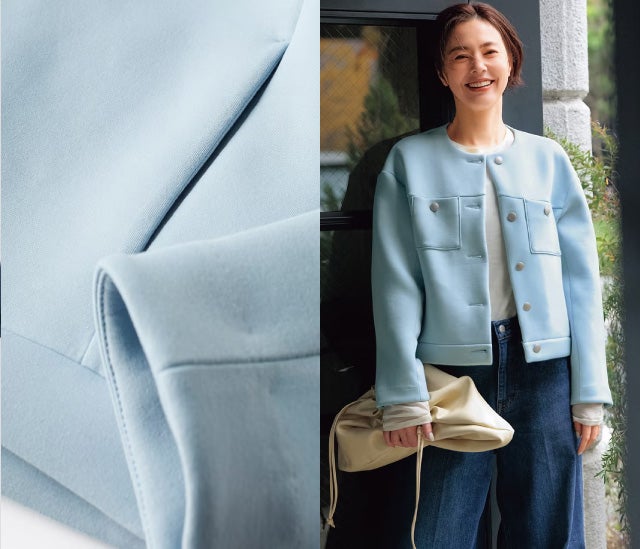 「エアーフォルム」2枚の生地と表と裏で継ぎ合わせた、別名ダンボール素材とも呼ばれるジャージー素材。軽く柔らかな着心地でありながらほどよいハリがあるので、体型を巧みにカバーしながら構築的なフォルムも美しく決まります。