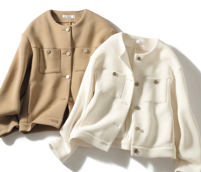 上品な光沢で、きちんと見えしながら堅苦しさのない「エアーフォルム」素材を使用。軽い着心地でありながら、柔らかなハリとふくらみが体型をカバーしながら美しいシルエットをキープします。キラリと光るメタルボタンがアクセのようなポイントに。