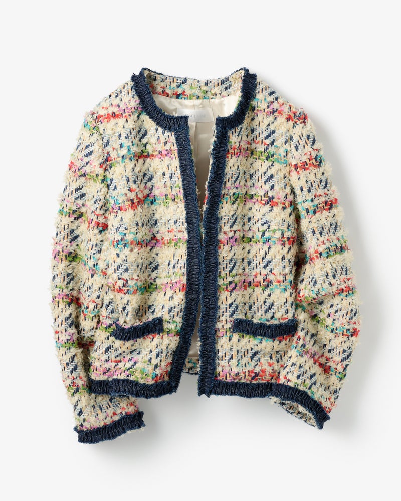 - 気持ちも華やぐ、カラフル&リッチなツイードの魅力テープヤーンやスラブ糸、ラメ糸など、色とりどりの様々な素材の糸を織り上げた、ファンシーツイードを採用。1枚羽織るだけで顔まわりを明るく魅せ、いつものスタイルも華やかに格上げしてくれます。