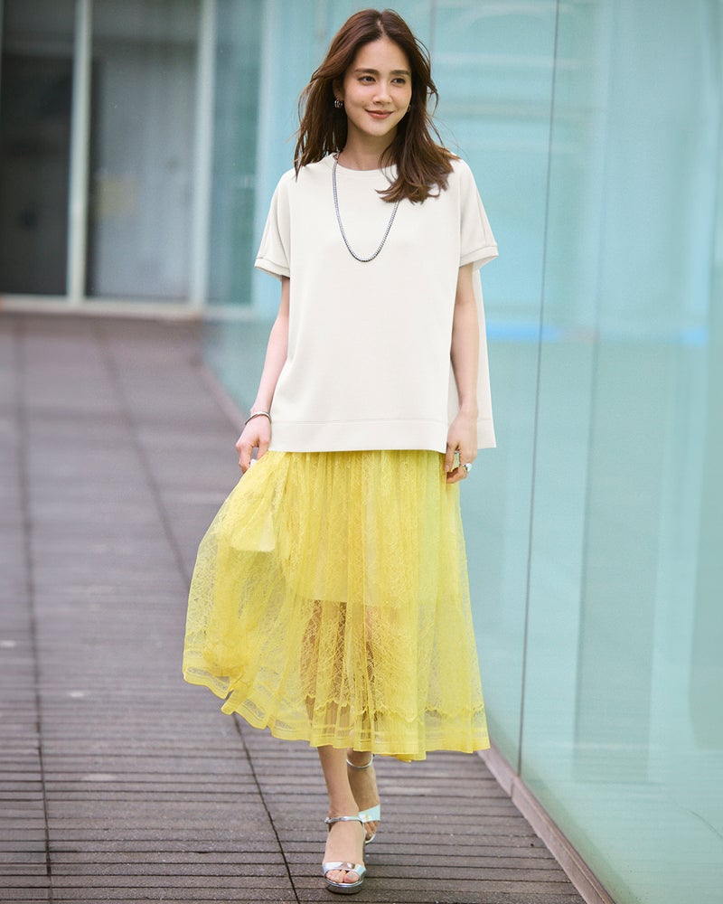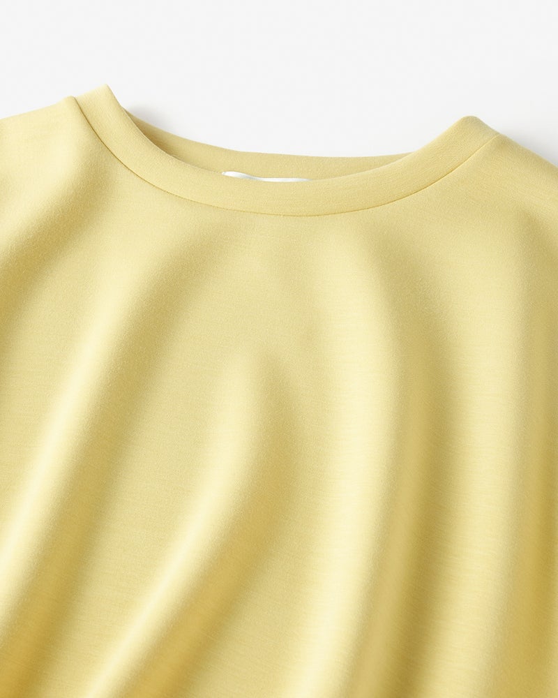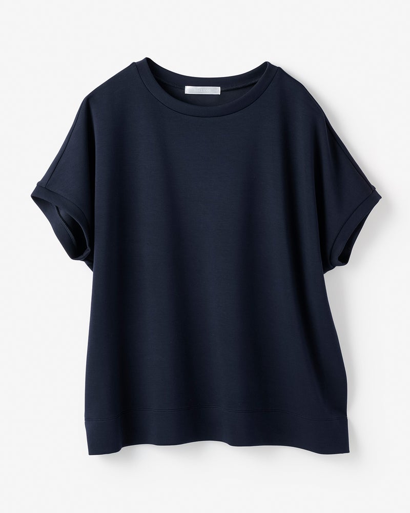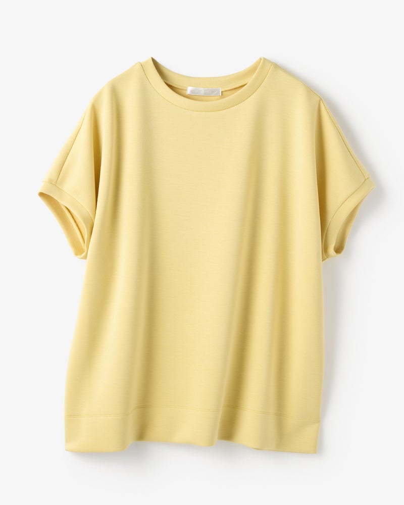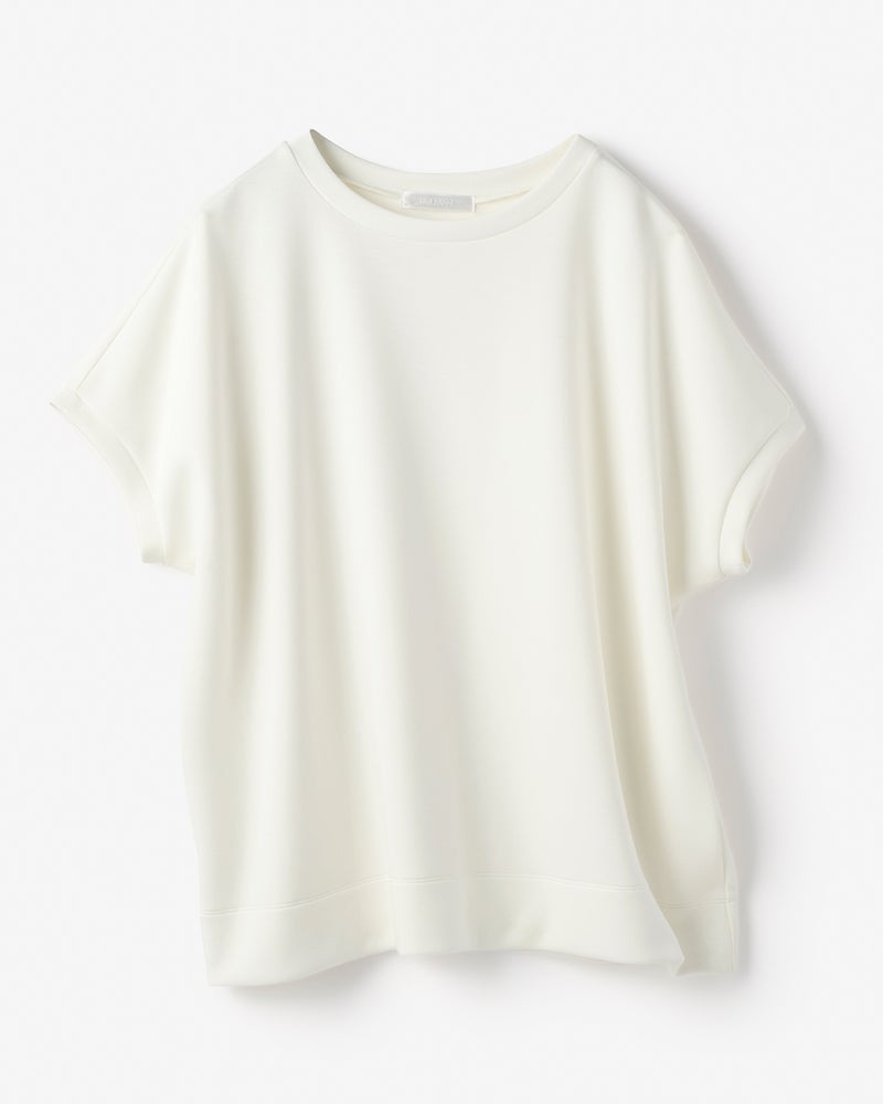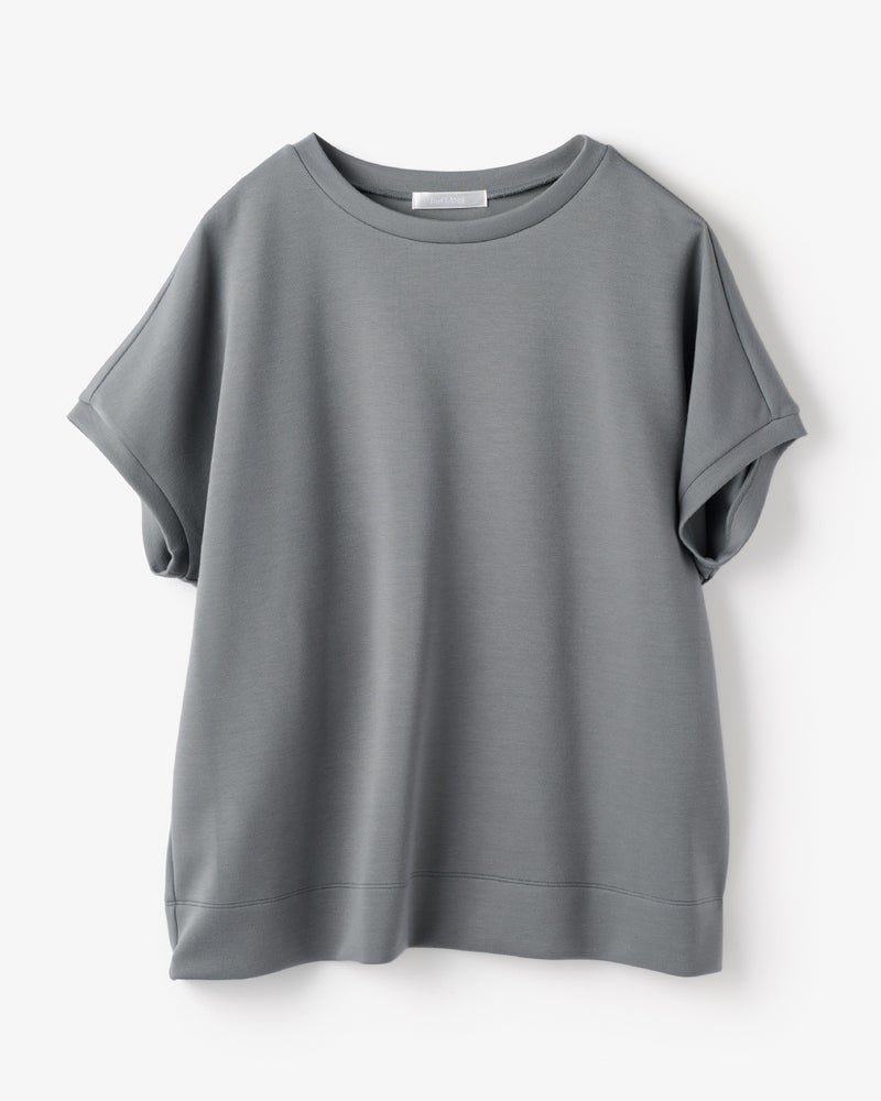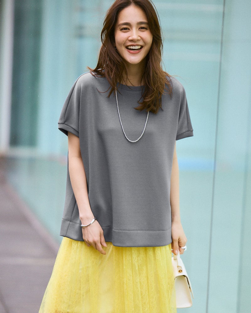 しっとりなめらかな表面感の中肉カットソー素材「シルキーダンボール」で仕立てたプルーバー。ゆったり身頃×フレンチスリーブが、大人ボディをほどよく華奢見せ。パンツにもスカートにも合わせやすい上質トップス、春夏のスタメンアイテムになりそう。
