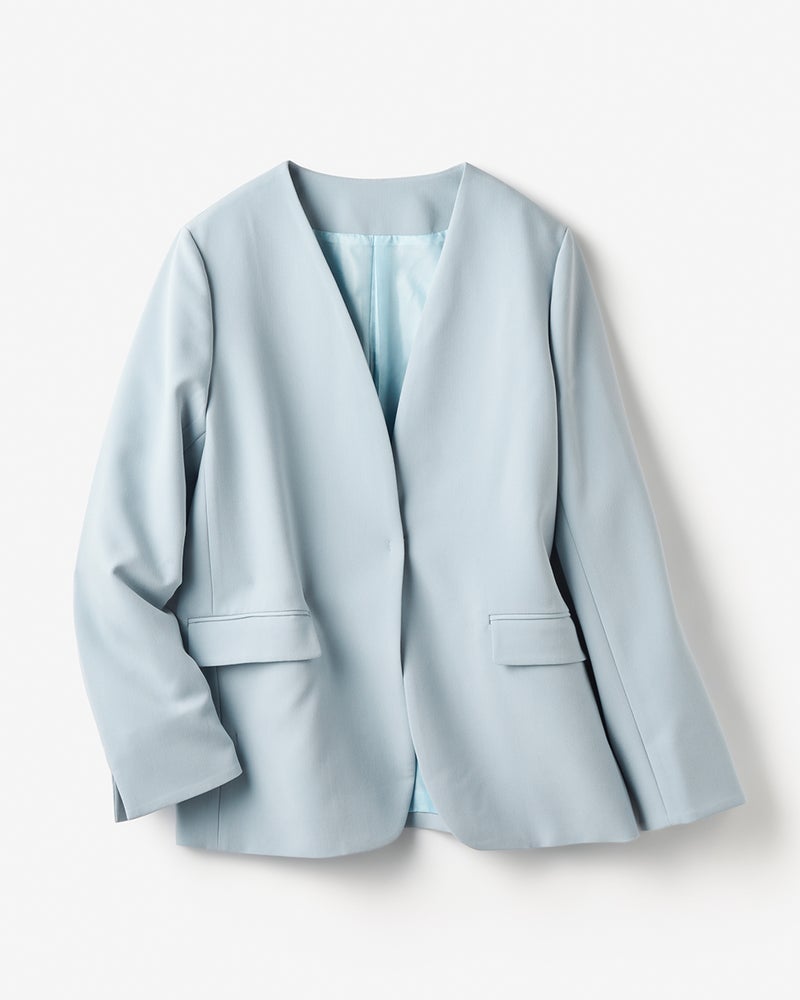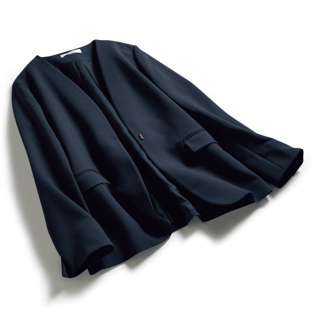 すっきり体に馴染む美フォルムノーカラーは、きちんと感と女性らしさを両立。袖口はスリット仕立てで、折り返しても素敵に。